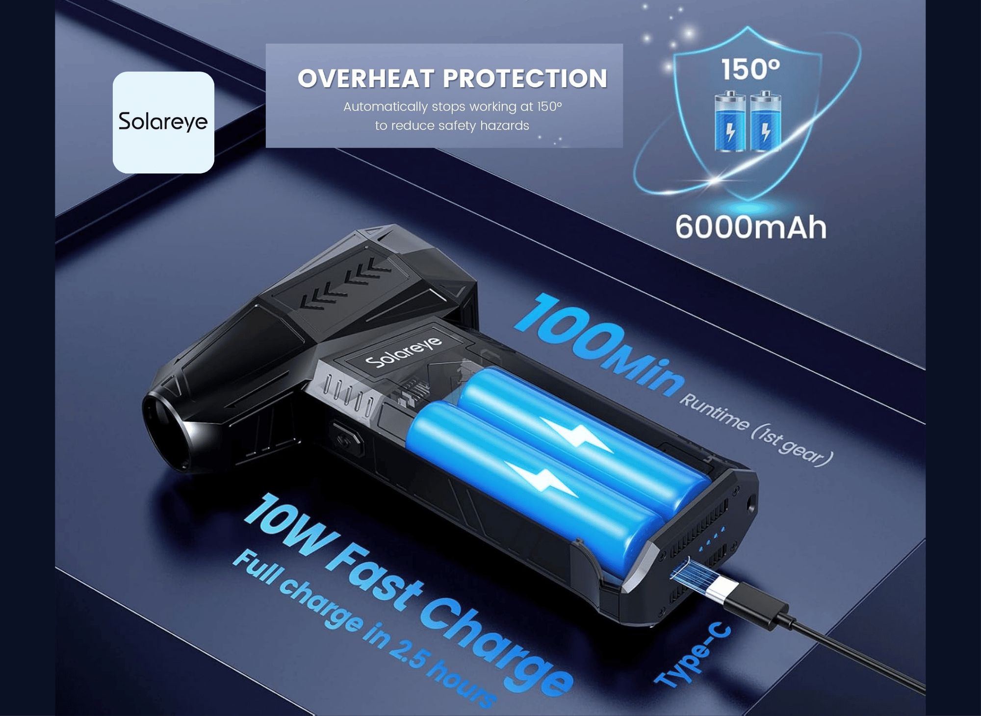 The device’s RPM (rotations per minute) and wind speed determine its ability to handle challenging cleaning tasks, making it suitable for cleaning your gaming pc. Models like the Solareye can produce 180000 RPM and the WOLFBOX MF100 can deliver up to 150,000 RPM, while the TRANSWARRIOR provides impressive wind pressure at 300,000 RPM.