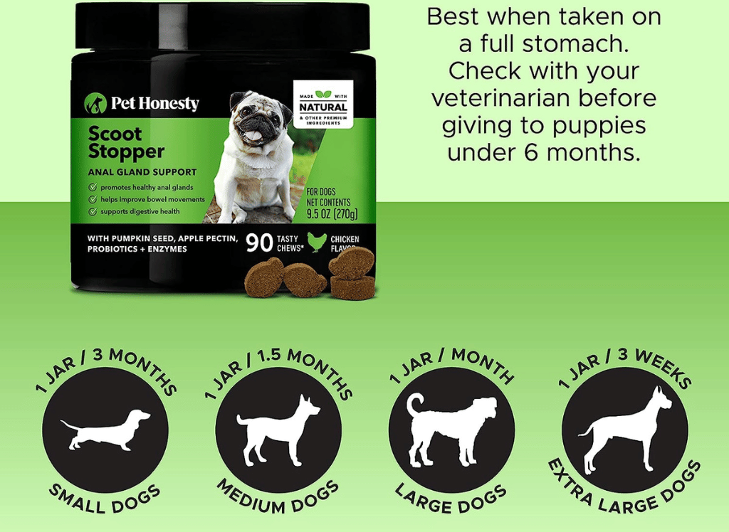 If you've ever encountered your pup dragging its hindquarters across the floor, it may be a sign that its anal glands need support. Now, taking care of your pet with this veterinarian-approved formula is easier than ever. This supplement is designed to minimize the need for dogs to scoot by promoting healthy anal gland functions and increasing fiber intake in one pet health package.