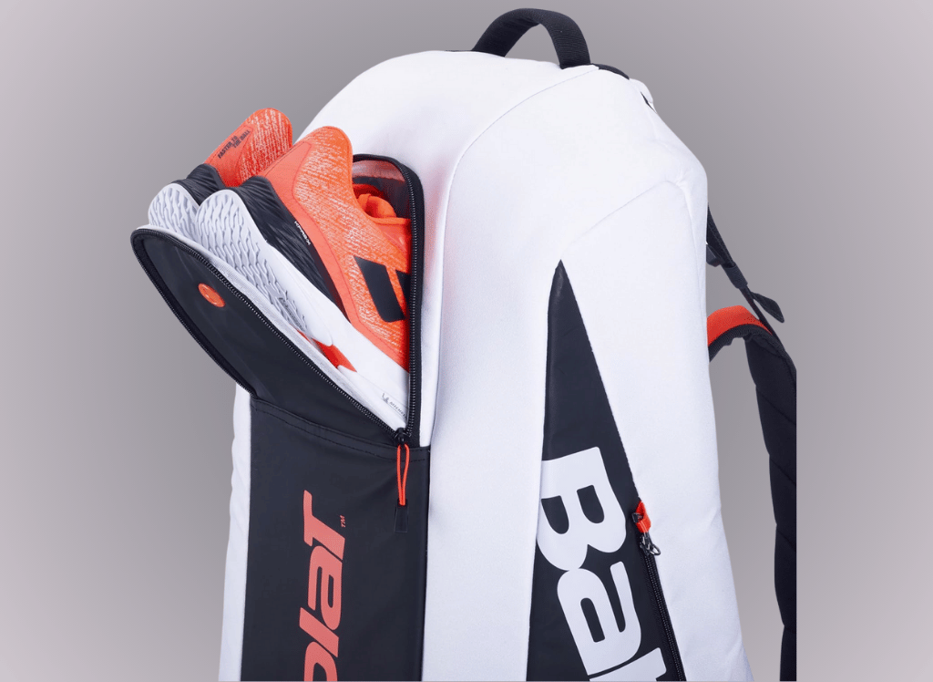 The Babolat Pure Strike 4th Gen Racquet Holder X6 Tennis Bag also features a transparent shoe compartment for easy organization and quick access. This seamless, waterproof compartment is vented to prevent odors from spreading throughout the bag.