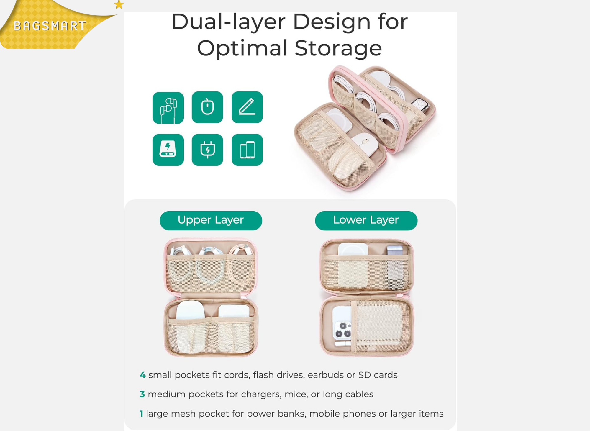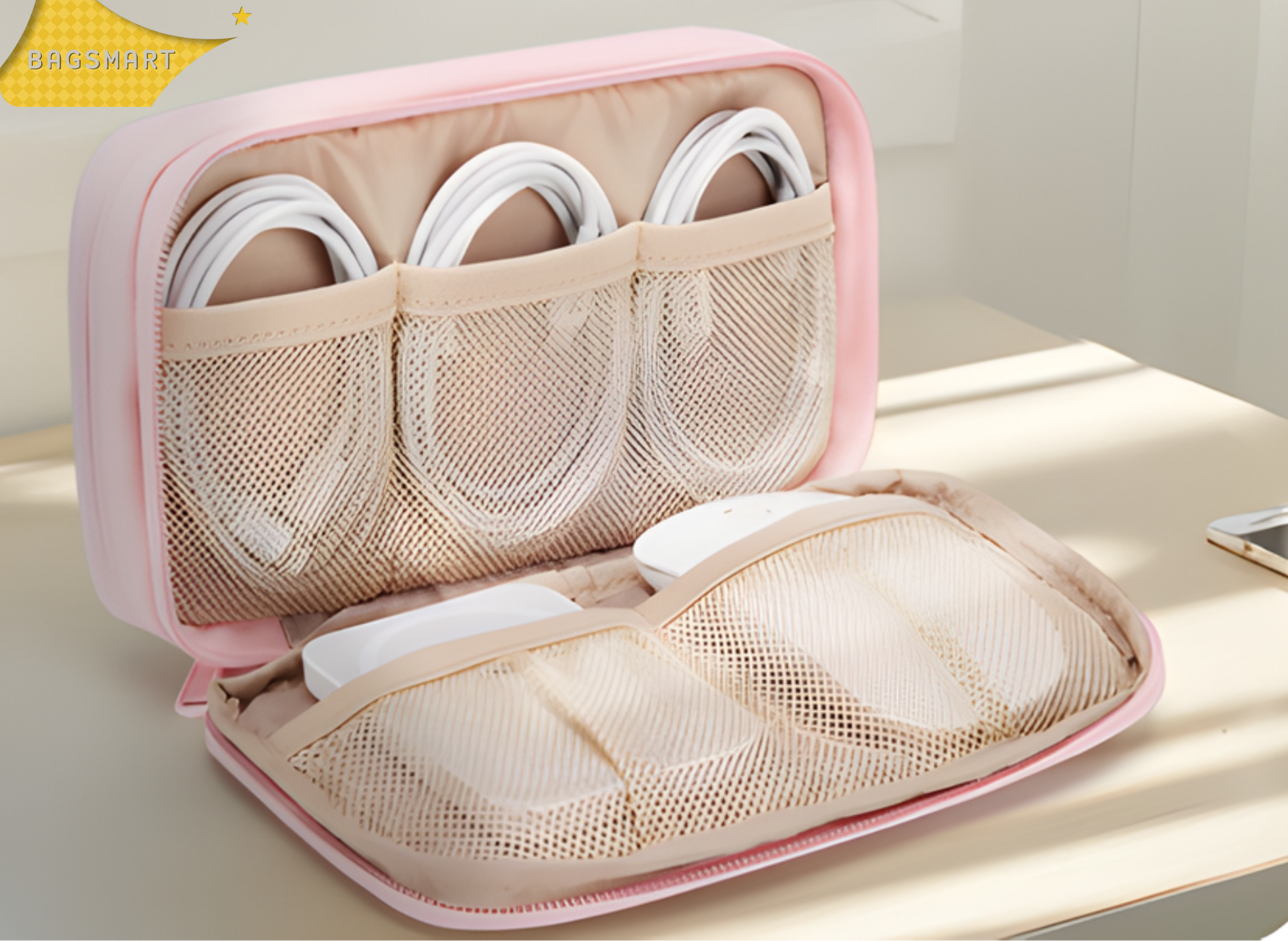 The dual-layer layout also means you can compartmentalize by type: chargers on one side, earbuds and adapters on the other. It's a small thing, but it saves real time when you're rushing through an airport or searching your bag in a dark car.