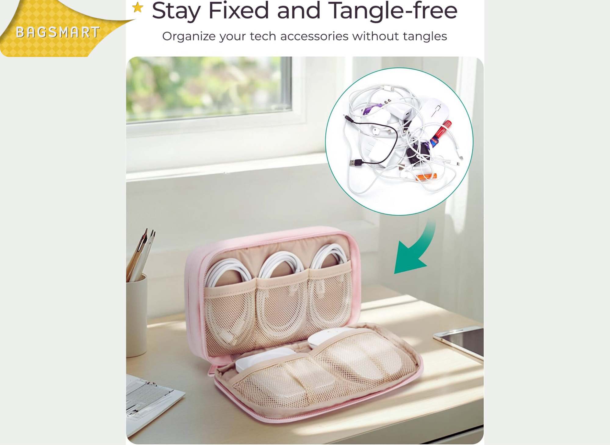 - Organization: Keeps cords and chargers neatly arranged and tangle-free