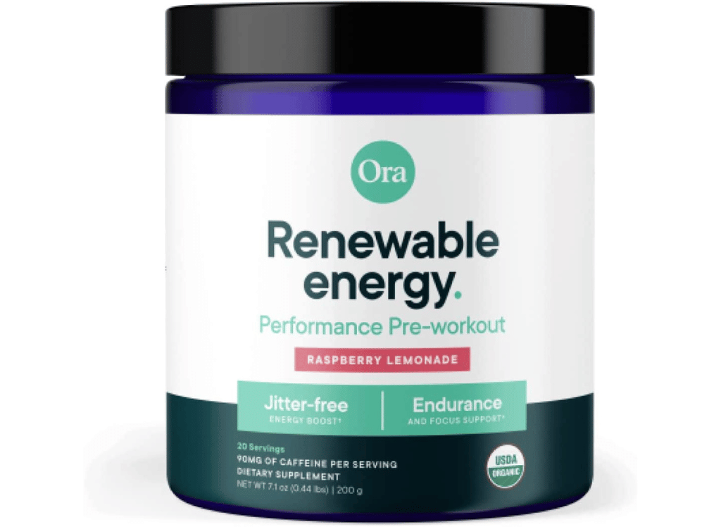 Ora Organic's Natural Pre-Workout Powder contains a blend of adaptogenic herbs such as Ashwagandha, Triphala, Rhodiola, and cordyceps mushroom to help you stay focused and promote endurance without spiking your energy levels or causing a crash after a workout.