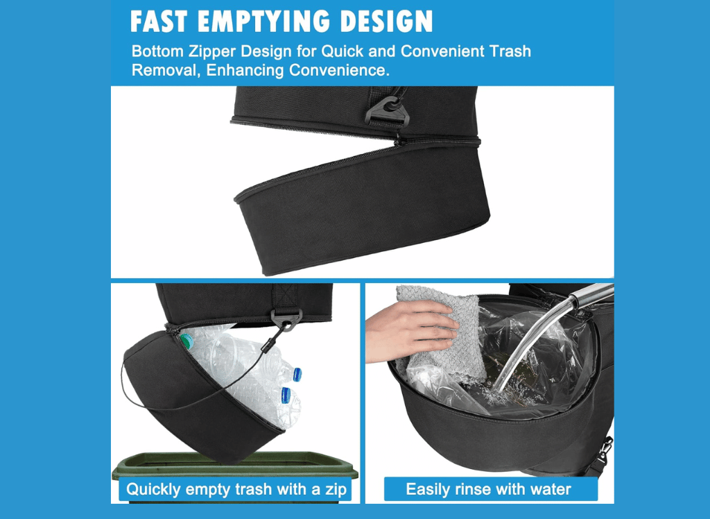 But its zippered bottom sets this boat trash bag apart, allowing quick and effortless garbage disposal in just two seconds. No more fiddling or flailing—unzip the bottom and hose out any odors, leaving your boat looking and smelling fresh.