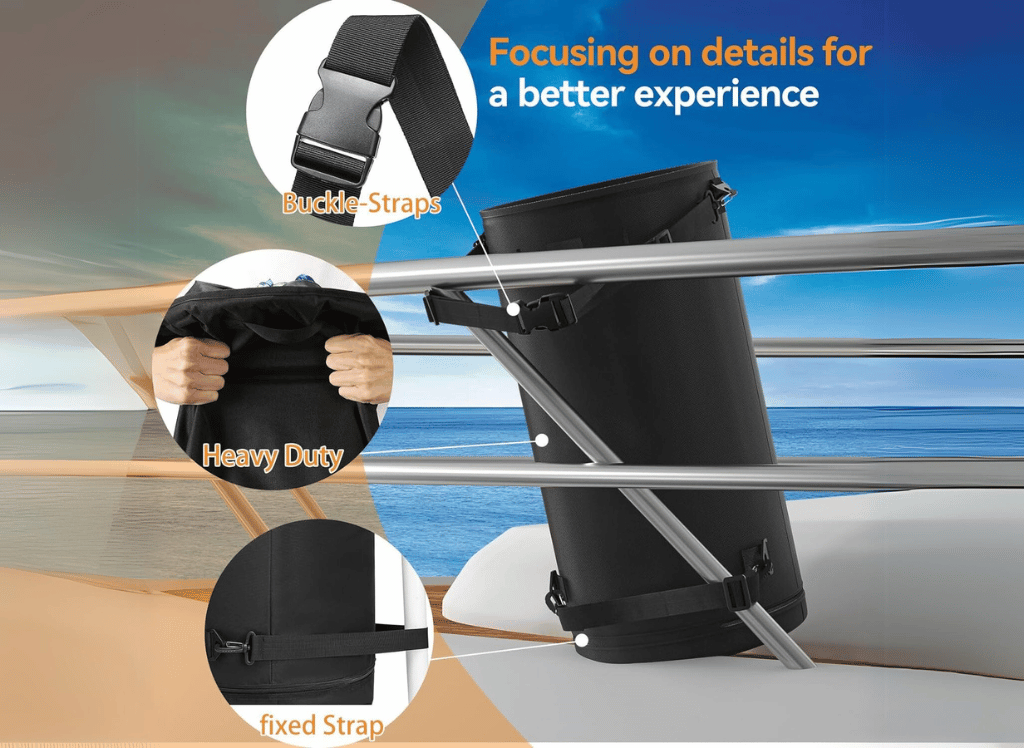 - Portability and Reusability: The trash can be easily carried, stored, and folded when unused, offering convenient transportation for boating trips.