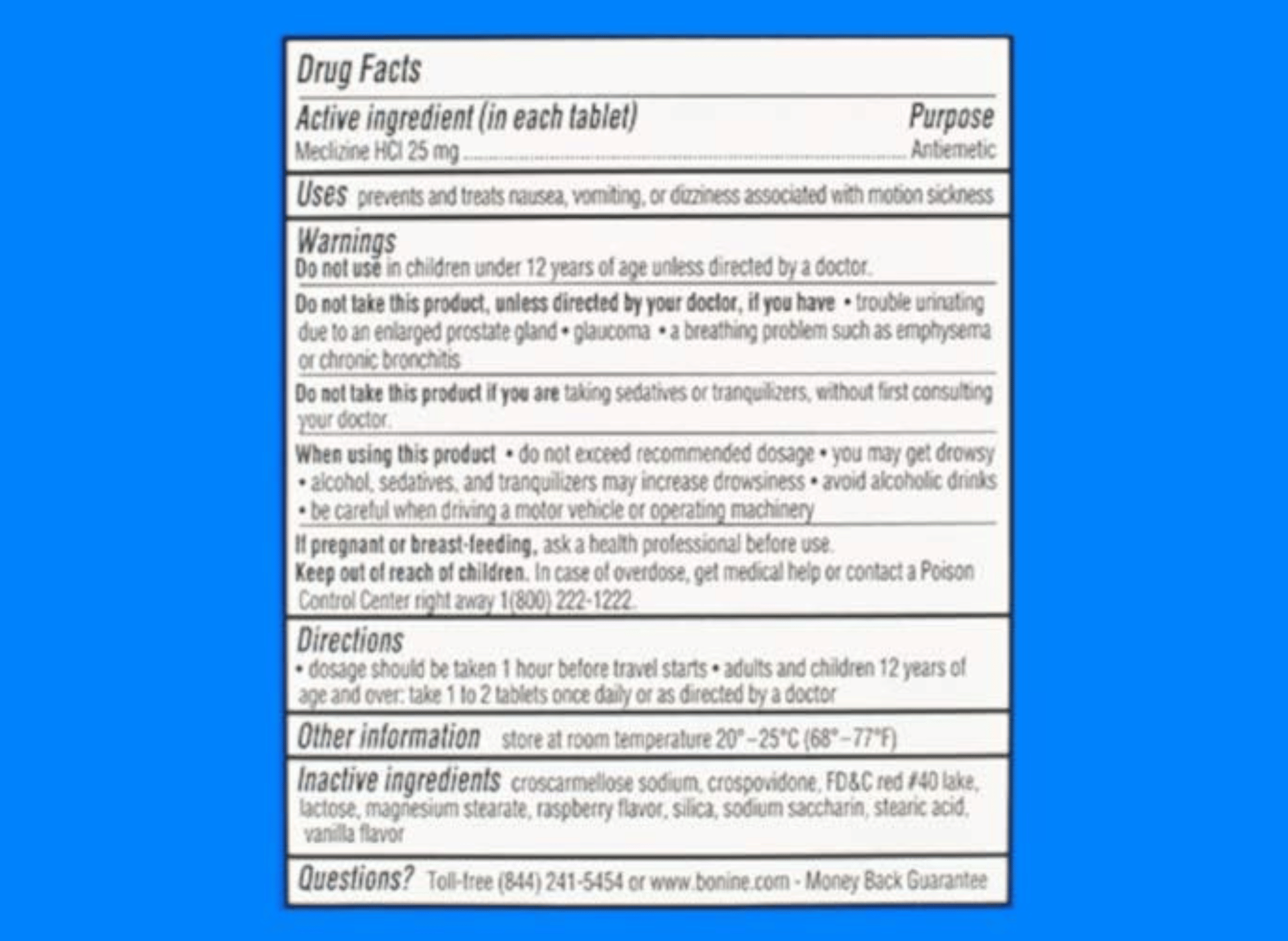 Fortunately, there are ways to prevent and treat motion sickness. Motion sickness medication, such as Bonine motion sickness tablets, offers effective relief. The active ingredient in Bonine, meclizine hydrochloride, works by calming the signals in your inner ear that trigger motion sickness symptoms.