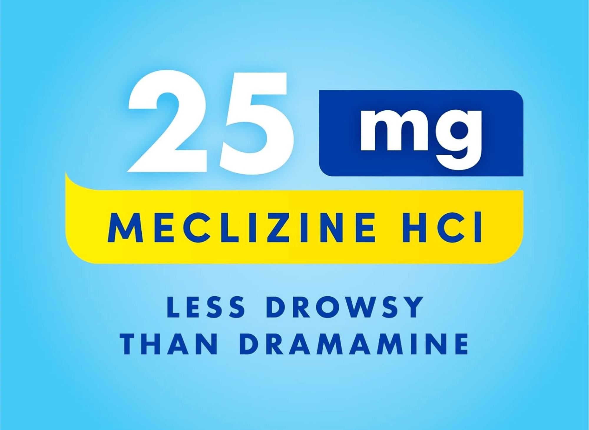 - Meclizine (Bonine): Meclizine is another antihistamine that is effective for motion sickness. Bonine is available as a chewable tablet, making it a convenient and palatable choice for travelers. The chewable, raspberry-flavored tablets are easy to take and are typically dosed at one to two tablets, depending on age and need. For best results, take Bonine one hour before travel starts. Bonine provides relief for up to 24 hours and helps prevent dizziness caused by motion sickness.
