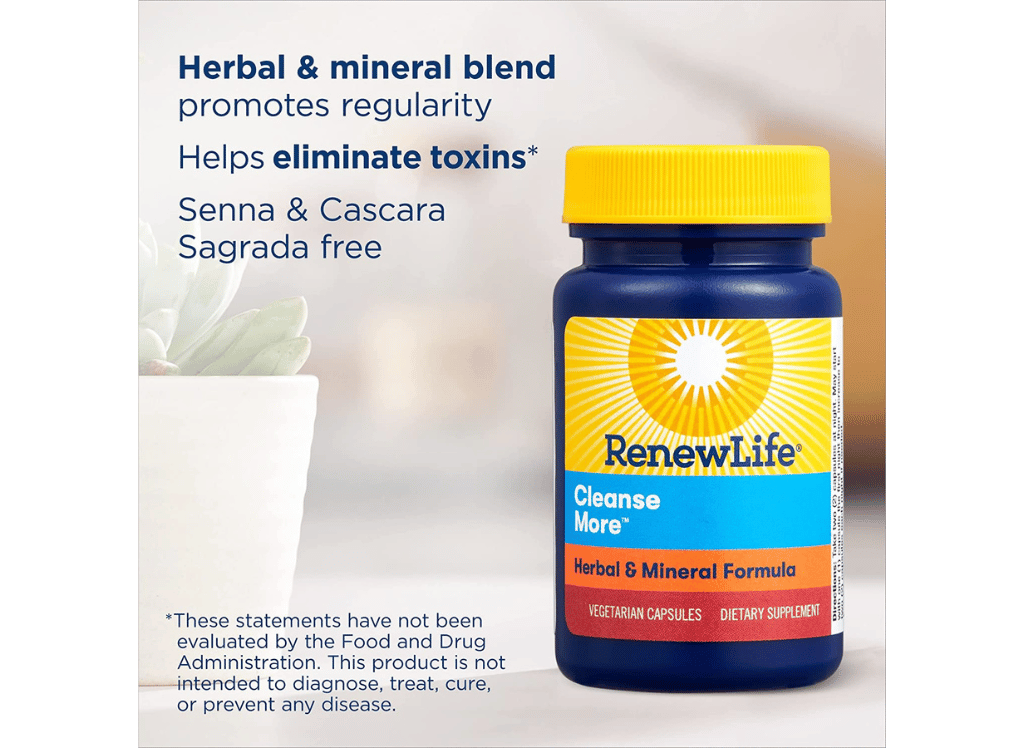 Renew Life Cleanse More is the #1 cleansing brand for adults, providing an effective and all-natural solution to occasional constipation. This potent herbal formula includes natural magnesium as well as soothing herbs and aloe to help you get comfortable relief without any cramping discomfort.