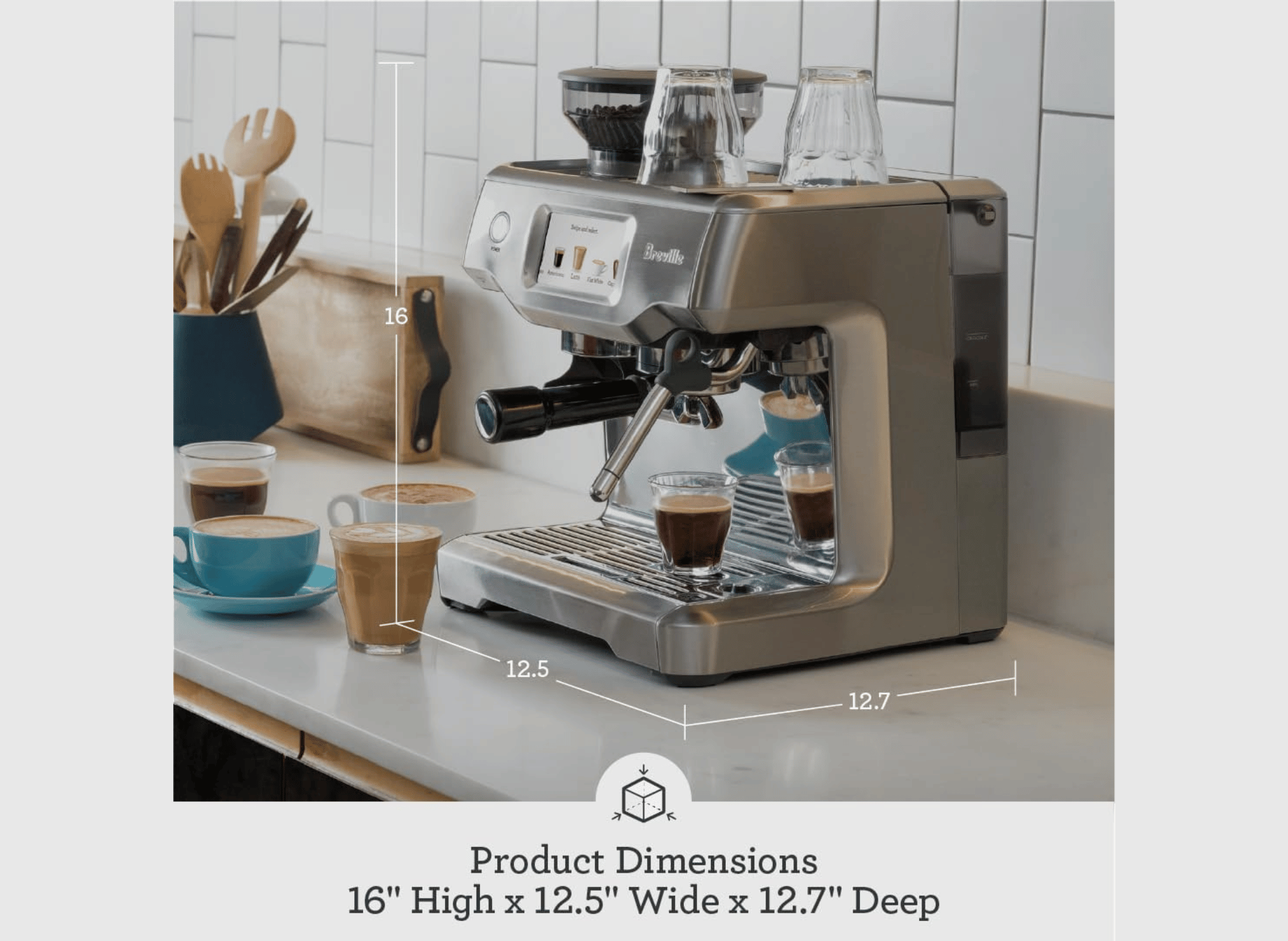 The Breville Barista Touch stands out not just for its advanced features but also for its robust and stylish design. Crafted primarily from brushed stainless steel, the machine feels solid, making it a centerpiece on any kitchen counter. The stainless steel body isn’t just about looks—it’s engineered for durability and easy cleaning with a simple wipe-down, ensuring your good Breville espresso machine stays looking great even after hundreds of uses.