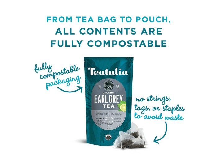 Their plant-based tea bags are free from micro-plastics, with no strings, tags, or staples to cut down on waste. Plus, the tea bag and pouch are commercially compostable.