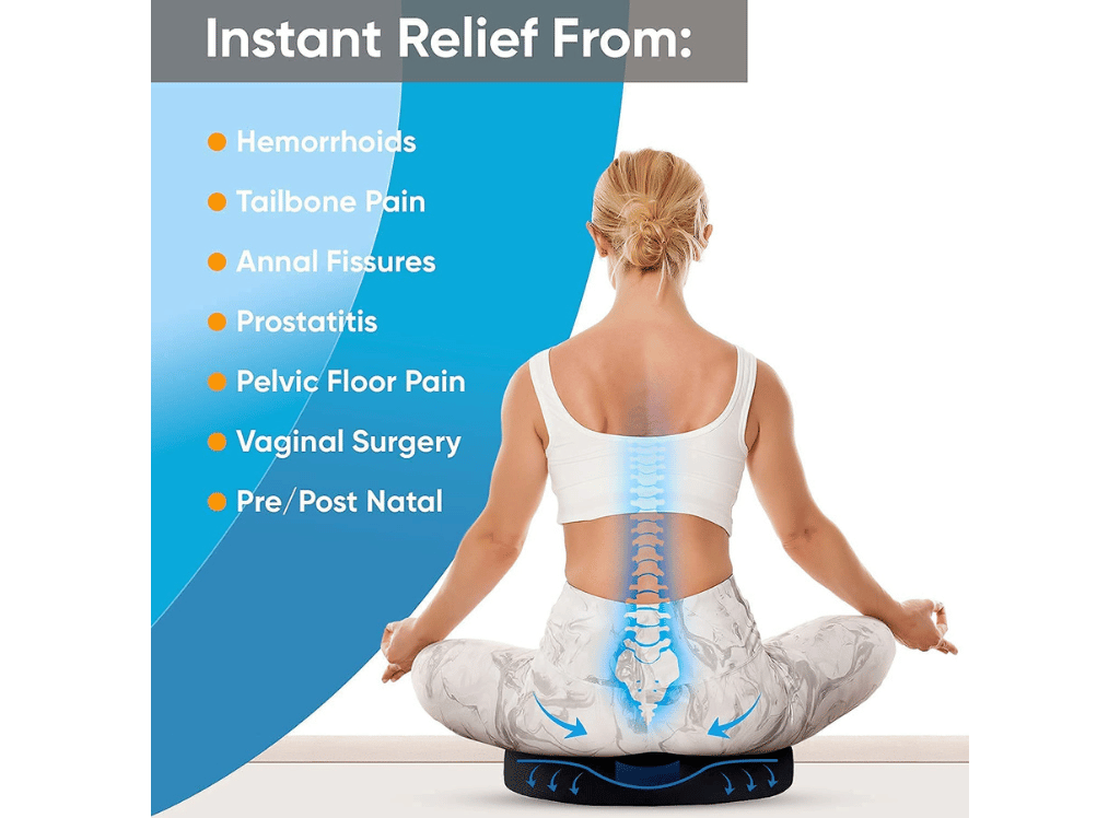 This cushion is perfect for those who suffer from hemorrhoids, hip bursitis, broken tailbone pain, herniated discs, bed sores, anal fissures, ischial tuberosity, fractured coccyx, pressure related to childbirth, vaginal surgery, and sitting for long periods of time that can cause lower back, hip, legs, and thighs pain.