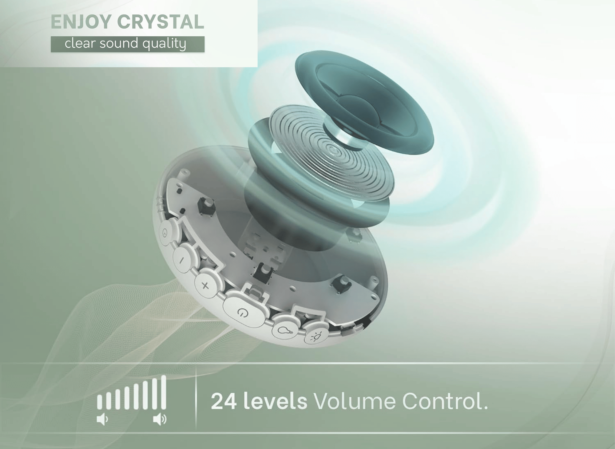 The Calm Me sound machine provides effortless sound through its user-friendly controls, allowing seamless adjustment for a peaceful environment. The Calm Me sound machine also features simple, user-friendly controls for effortless sound and light adjustments.