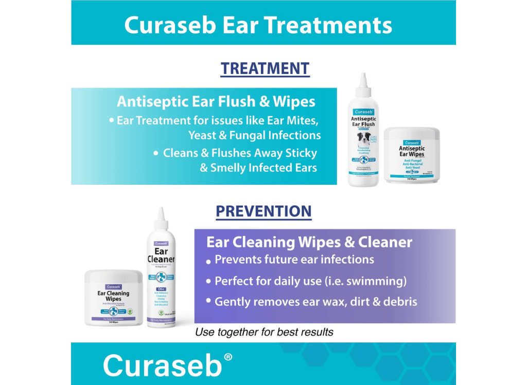 Curaseb Ear Flush should be used in tandem to provide active treatment against ear infections within the ear canal, as wipes alone are not enough. This non-stinging product is made in the USA and provides reliable protection for your pet's sensitive ears.