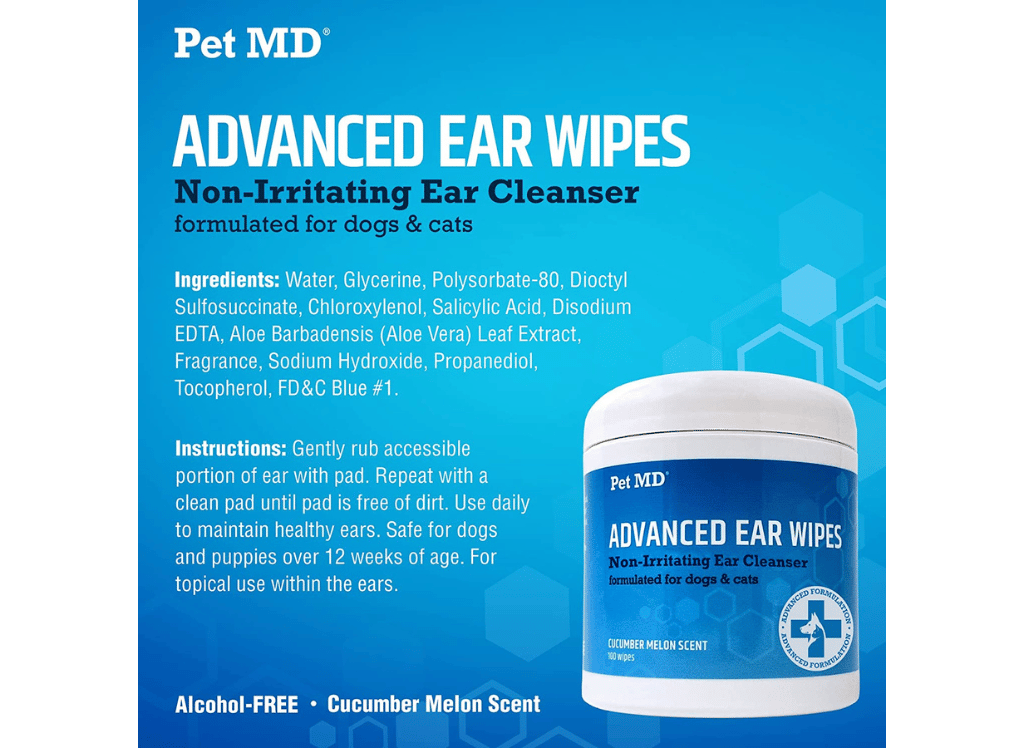 Pet MD Ear Wipes is an advanced formulation designed to clean, deodorize, and help prevent infections of the ear caused by dirt buildup and wax. With a pleasant Cucumber Melon scent, these wipes reduce foul odors and discomfort caused by infections, making it an enjoyable experience for cats and dogs.