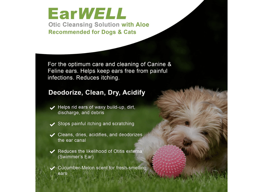 VetWELL is a veterinarian-formulated ear cleanser that gently and safely removes wax, fluid, dirt, debris, and more from your pet's ears. It features aloe vera to soothe the ear canal and won't sting or burn upon application.