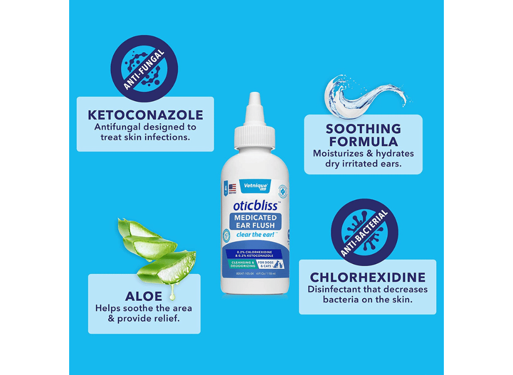 Vetnique Labs' Oticbliss Medicated Dog Ear Flush is a veterinary-formulated ear flush designed to cleanse and deodorize your pet's ears. It contains two powerful active ingredients - Chlorhexidine and Ketoconazole – that provide effective relief from itchy, scaly irritation caused by ear infections.