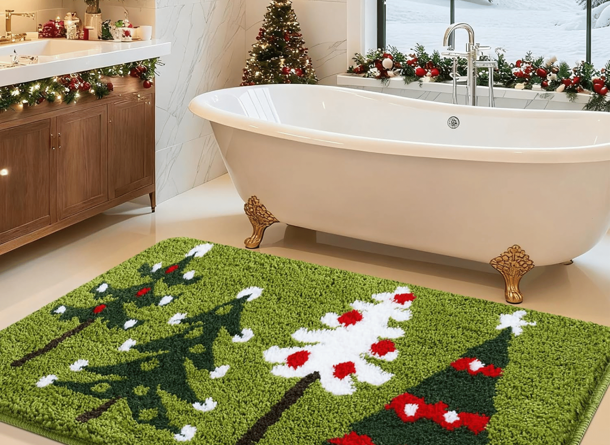 With so many options available, you’ll find everything from thick, plush, fluffy rugs for a luxurious feel to quick-drying mats that are easy to maintain. Styles range from farmhouse and rustic themes, perfect for a cozy New Year’s Eve look, to more traditional Christmas designs that bring classic holiday spirit to your bathroom. Prices vary widely, so whether you’re looking for a budget-friendly update or a premium addition, there’s something for every home and every cart.