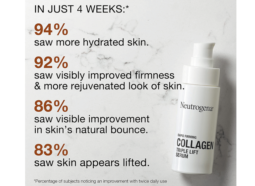 Neutrogena is a trusted brand recommended by dermatologists, and their firming facial collagen serum can provide powerful results. After just four weeks of regular use, 92% of users experienced an improvement in the appearance of their skin's natural firmness and rejuvenation, while 86% saw visible improvement in the bounce of their skin in addition, 83% of subjects experienced a more lifted look and 81% experienced a more contoured appearance.