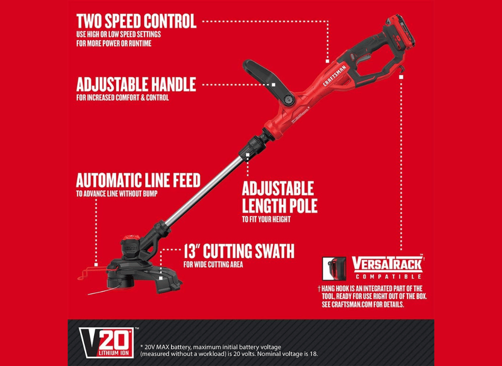 Craftsman V20 Weedwacker String Trimmer & Edger is a versatile and powerful addition to your lawn care arsenal. Powered by a battery, this string trimmer and edger is part of the V20 cordless system, allowing you to move around without being tethered to a power outlet.