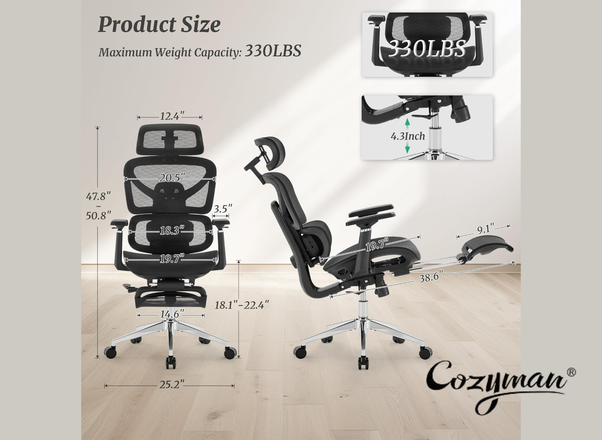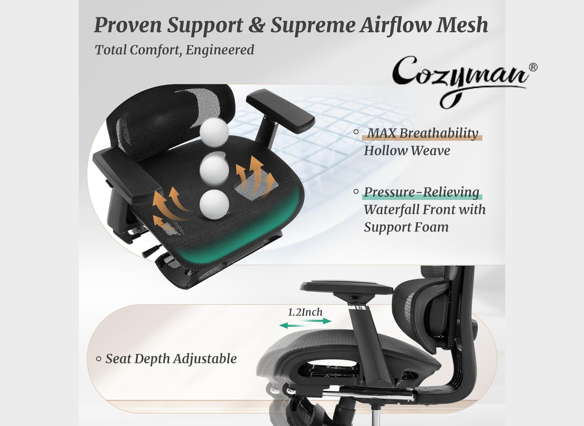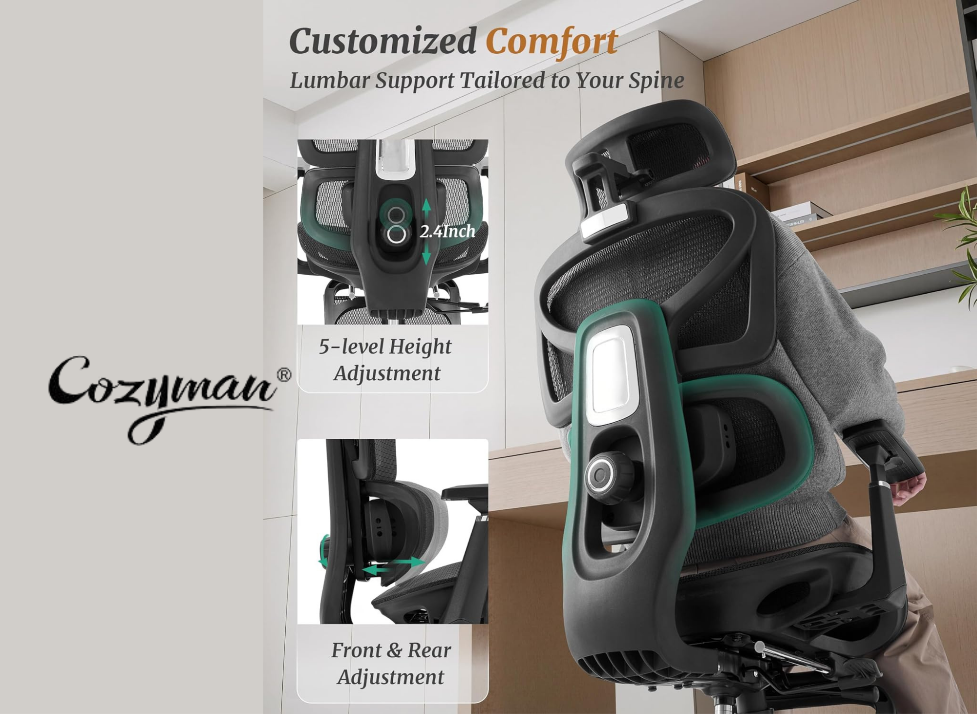 The Cozyman Ergonomic Office Chair with Footrest represents a massive upgrade over standard office seating. With its precision 5-level adjustable lumbar support, breathable mesh material, 4D armrests, and built-in footrest, it provides an unparalleled level of customized comfort. It supports your body through long hours of focused work and offers a relaxing recline when you need to rest.