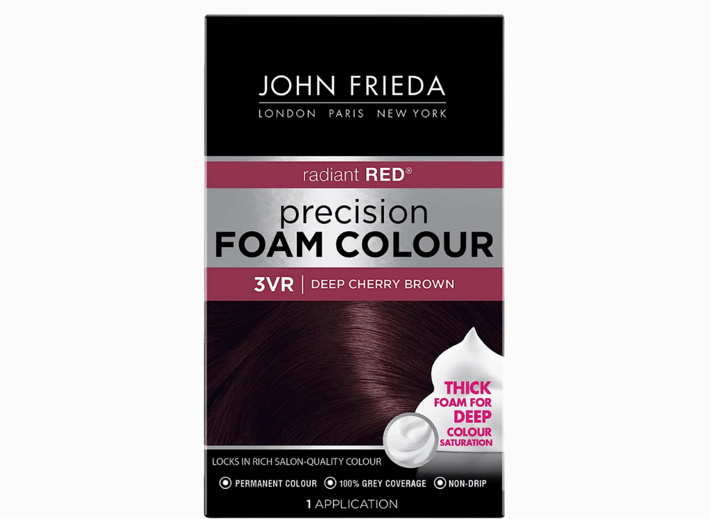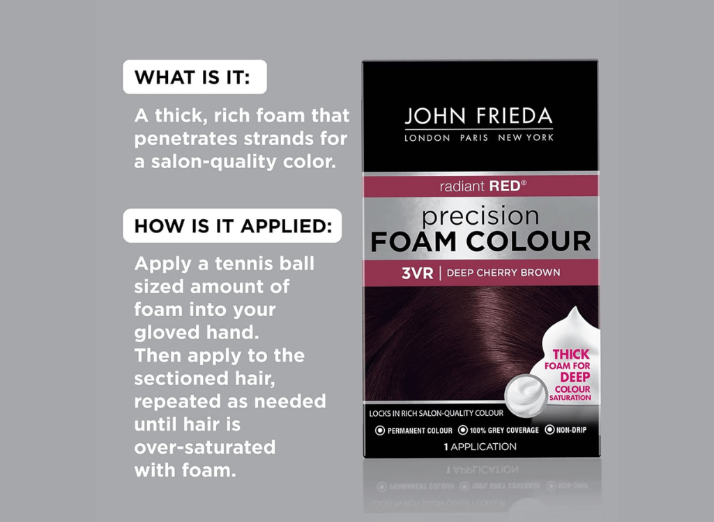John Frieda Cherry Red dark hair Color is an easy-to-use, precision foam color that allows you to achieve stunning, all-over 100% grey coverage in the comfort of your own home. The non-drip formula spreads quickly and evenly into roots and hard-to-reach areas for maximum coverage with minimal hassle. With John Frieda's Precision Foam Color, you can create perfect, vibrant color results each and every time.