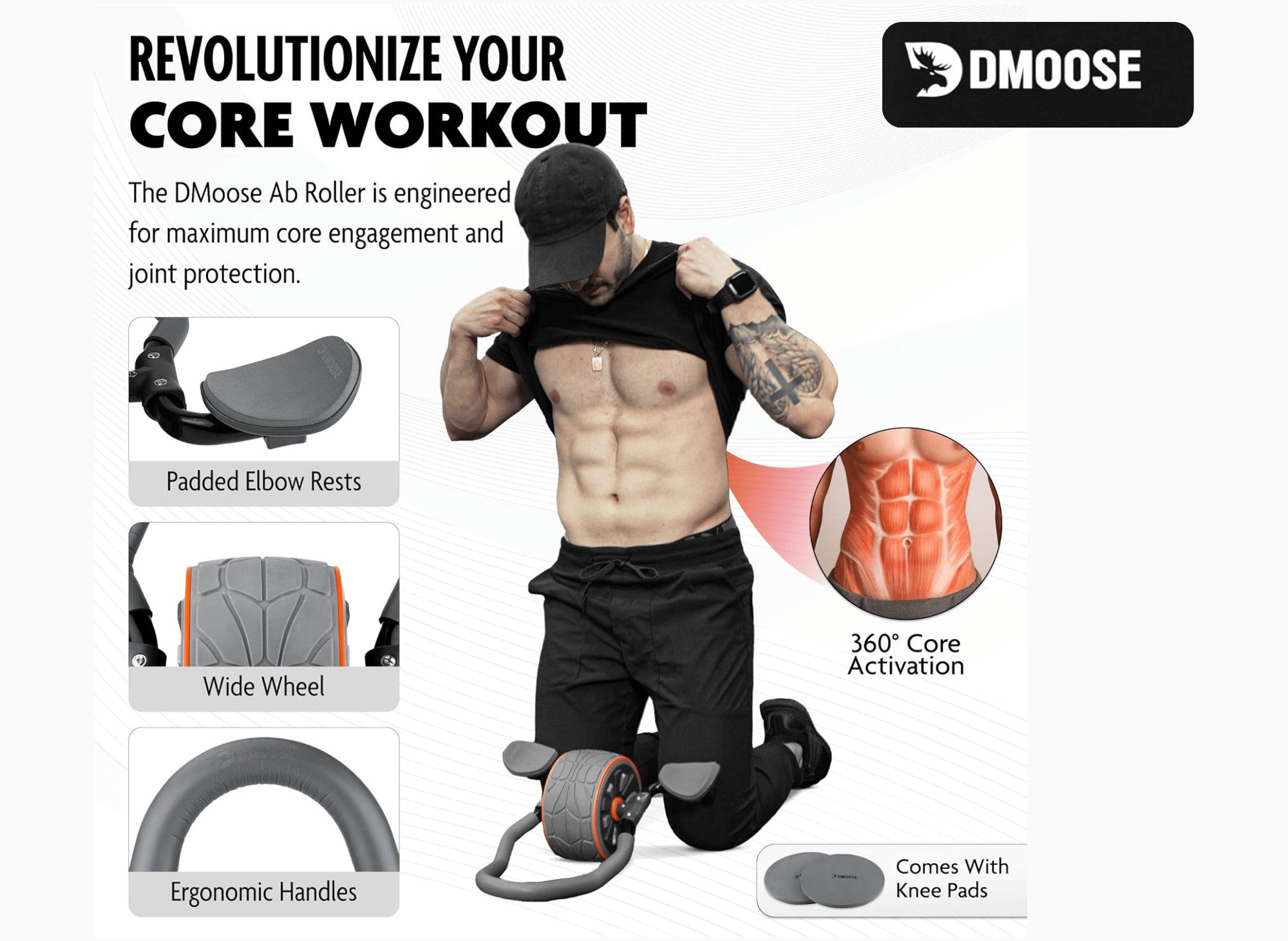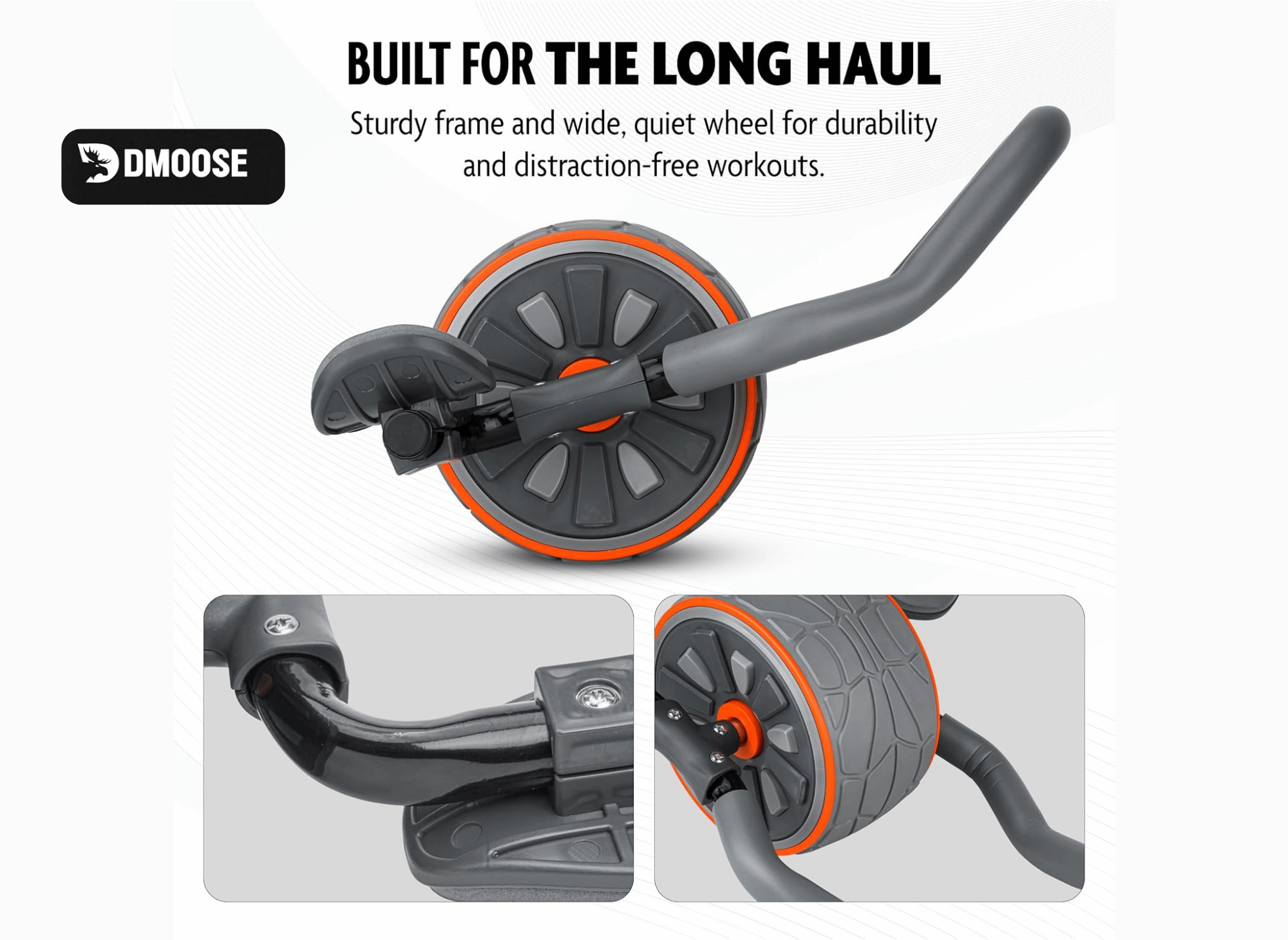 The DMoose Ab Wheel Roller is a high-quality fitness tool featuring a unique design, including stainless steel handles, padded handles, elbow supports, and a smooth, stable rolling surface.