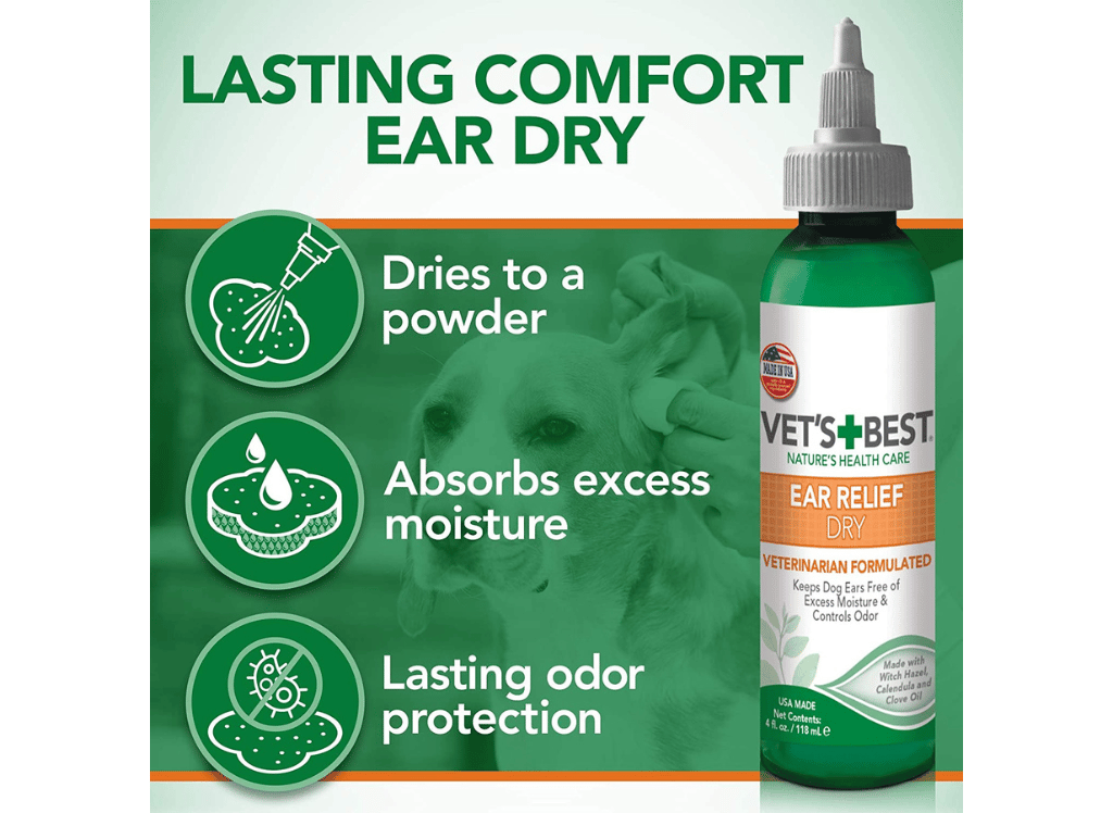 Vet's Best Dry Dog Ear Relief provides natural relief and comfort for your pup. This alcohol-free, stinging-free liquid is formulated to keep ear canals dry while soothing raw or greasy ears. When the product dries, it turns into a soft powder that promotes clean ears after swimming or bathing. Use Vet's Best Dog Ear Relief Wash to best support healthy ear canal health when used in conjunction with this product. Help keep your furry friend comfortable and relieved of any irritations with Vet's Best Dry Dog Ear Relief!