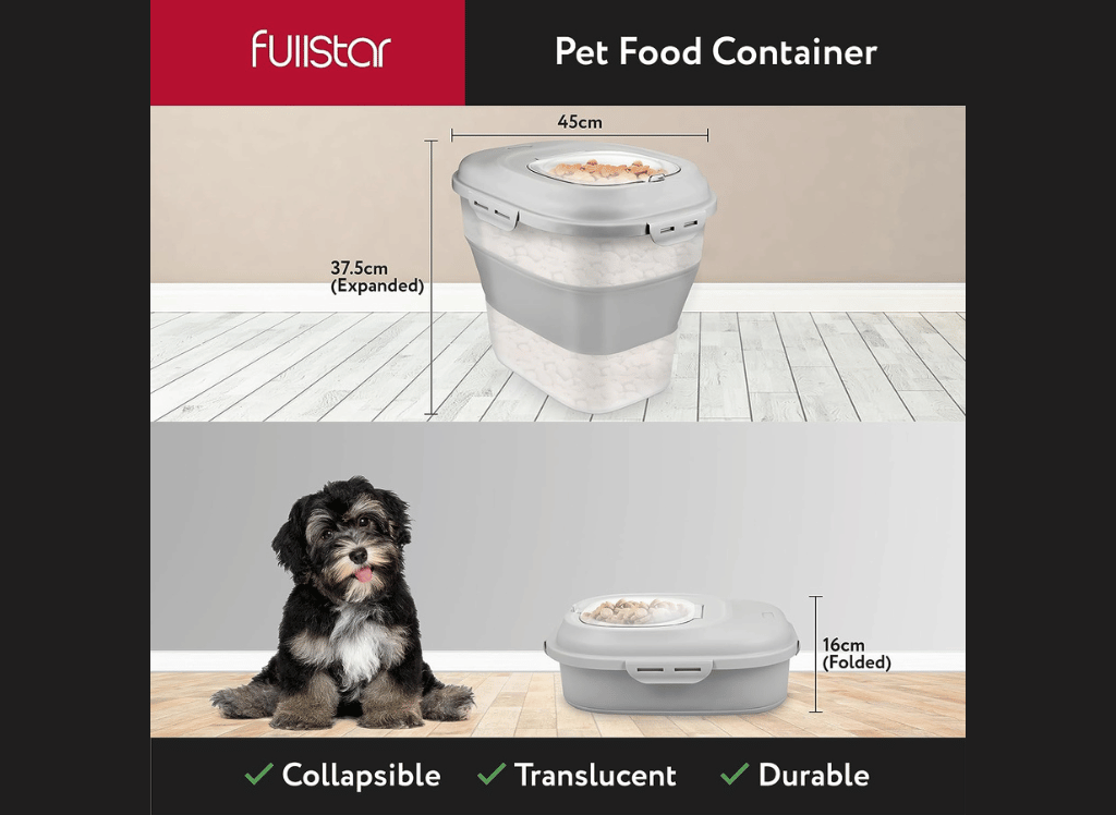 Measuring 17.32 x 9.8 x 7.88 inches, this container is suitable for storing 3.5 pounds to 13 pounds of pet food. And with the ability to fold down to 17.32 x 9.8 x 3.55 inches, you can easily resize it to fit in any space.