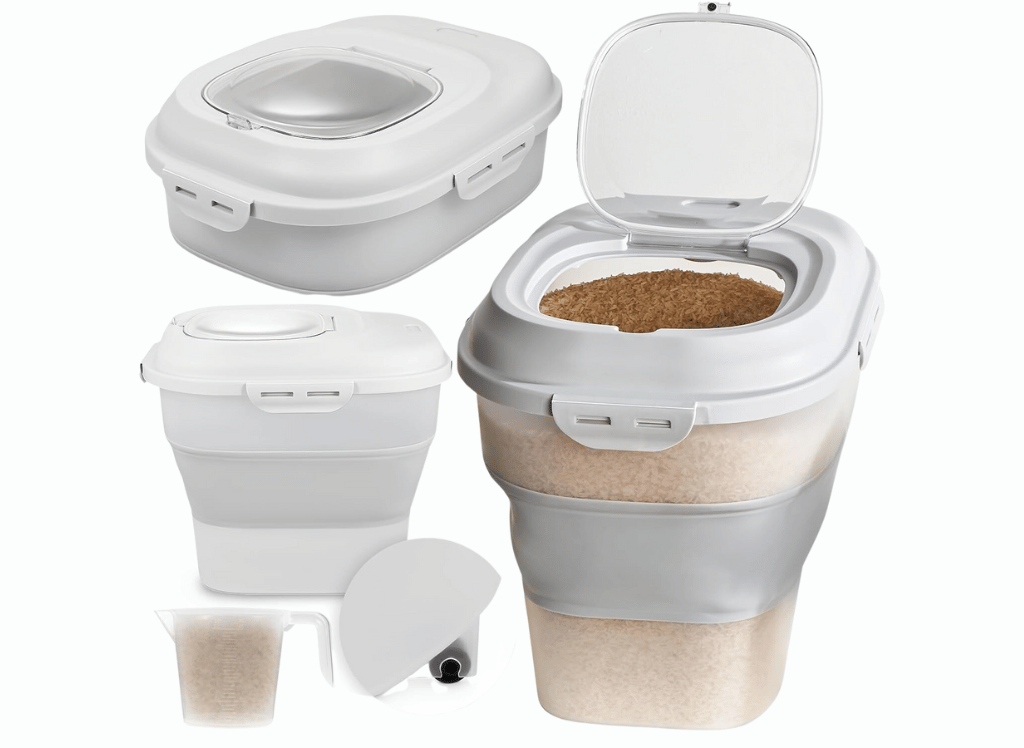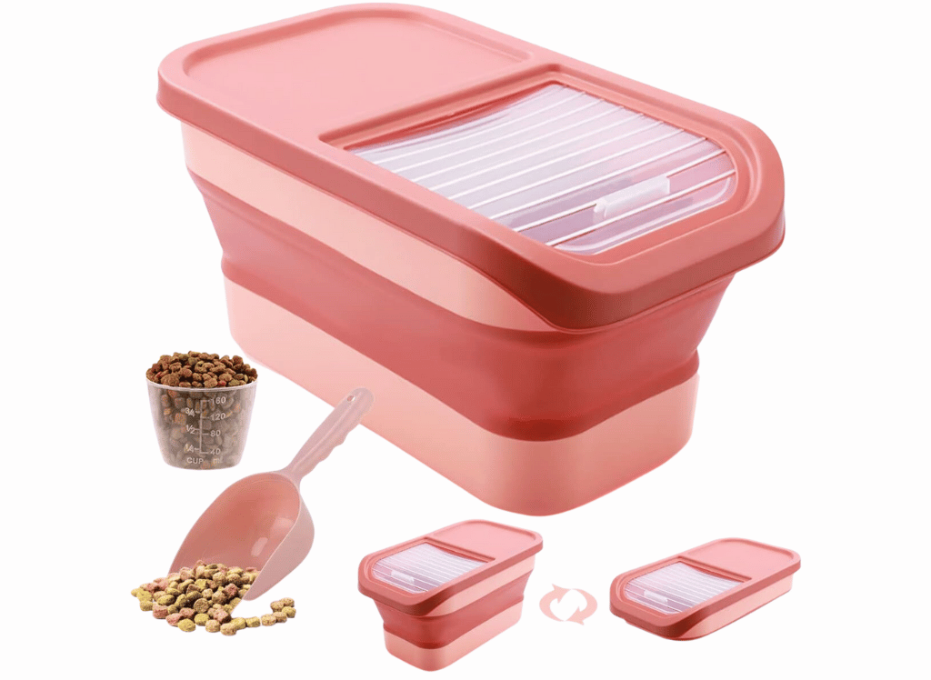 Measuring 17.32 x 9.8 x 7.88 inches, this container is suitable for storing 3.5 pounds to 13 pounds of pet food. And with the ability to fold down to 17.32 x 9.8 x 3.55 inches, you can easily resize it to fit in any space.