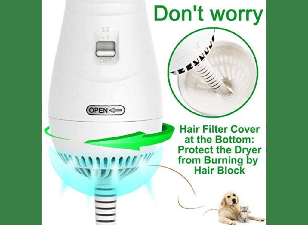 The hair filter cover at the bottom also makes it easy to clean up afterward. This pet grooming dryer is compact and portable, weighing only 13 ounces and providing great flexibility for users on the go. It’s an essential tool to have for any pet owner who wants to keep their furry friend looking its best.
