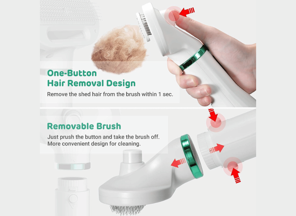 - 2-in-1 Functionality: This device combines the functionalities of a pet dryer and a grooming brush into one handy tool, making pet care more convenient and efficient.