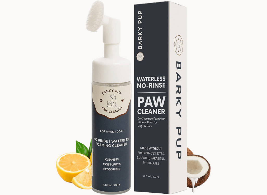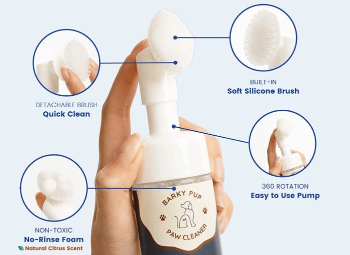 The best part? Barky Pup no-rinse, foaming paw cleanser combined with a built-in, removable soft silicone paw scrubber makes cleaning your furry friend's paws a breeze. It’s perfect for on-the-go cleaning after walks and between baths.