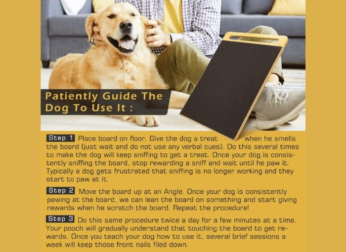 One option is a dog scratchboard, designed to file your dog's nails without the use of clippers or grinders. With patience and practice, your dog can learn to peacefully place their paws on the board for a quick and easy nail-trimming experience.
