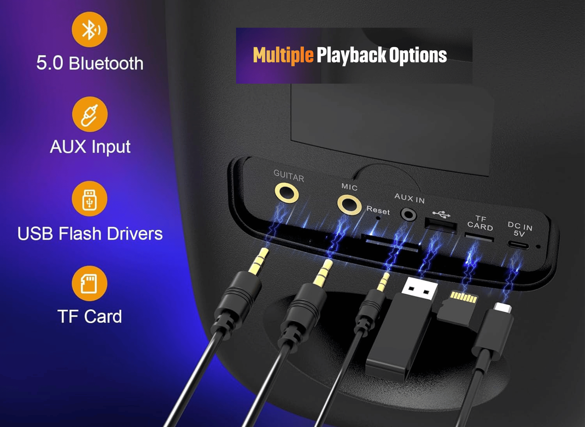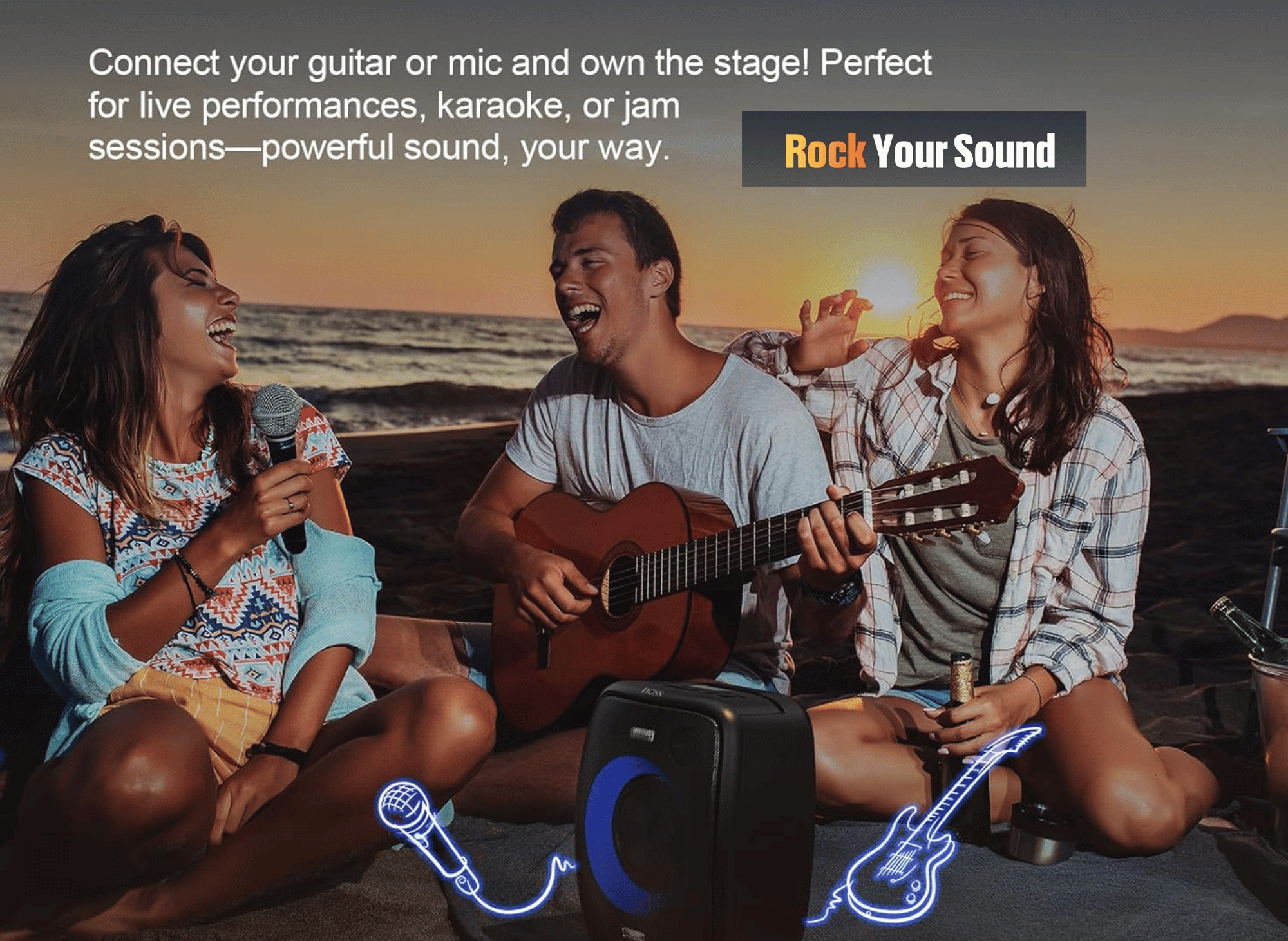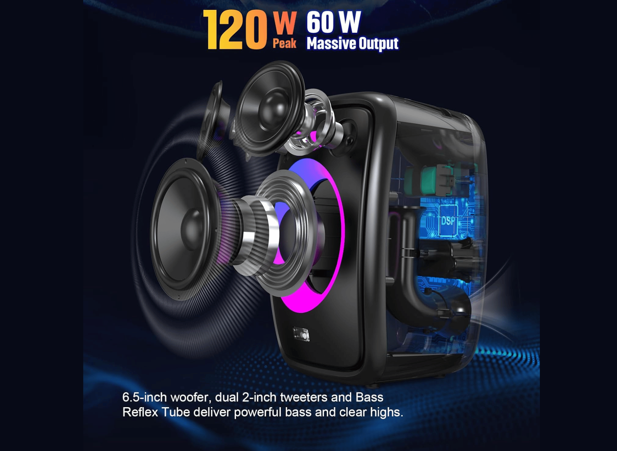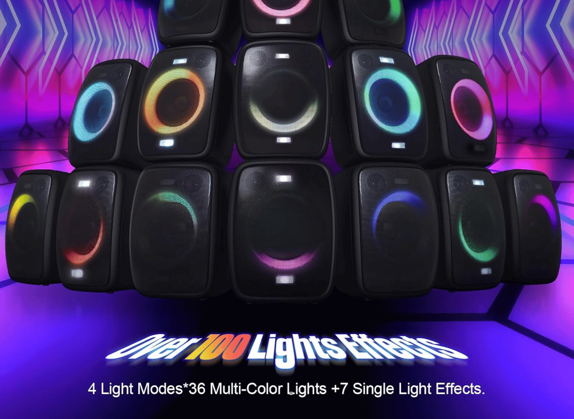 120W Stereo Sound, 2.1 Channel System, Punchy Bass, Lights Show, Splash Proof Design, PartySync, Mic and Guitar Inputs, Outdoor Speaker for Party