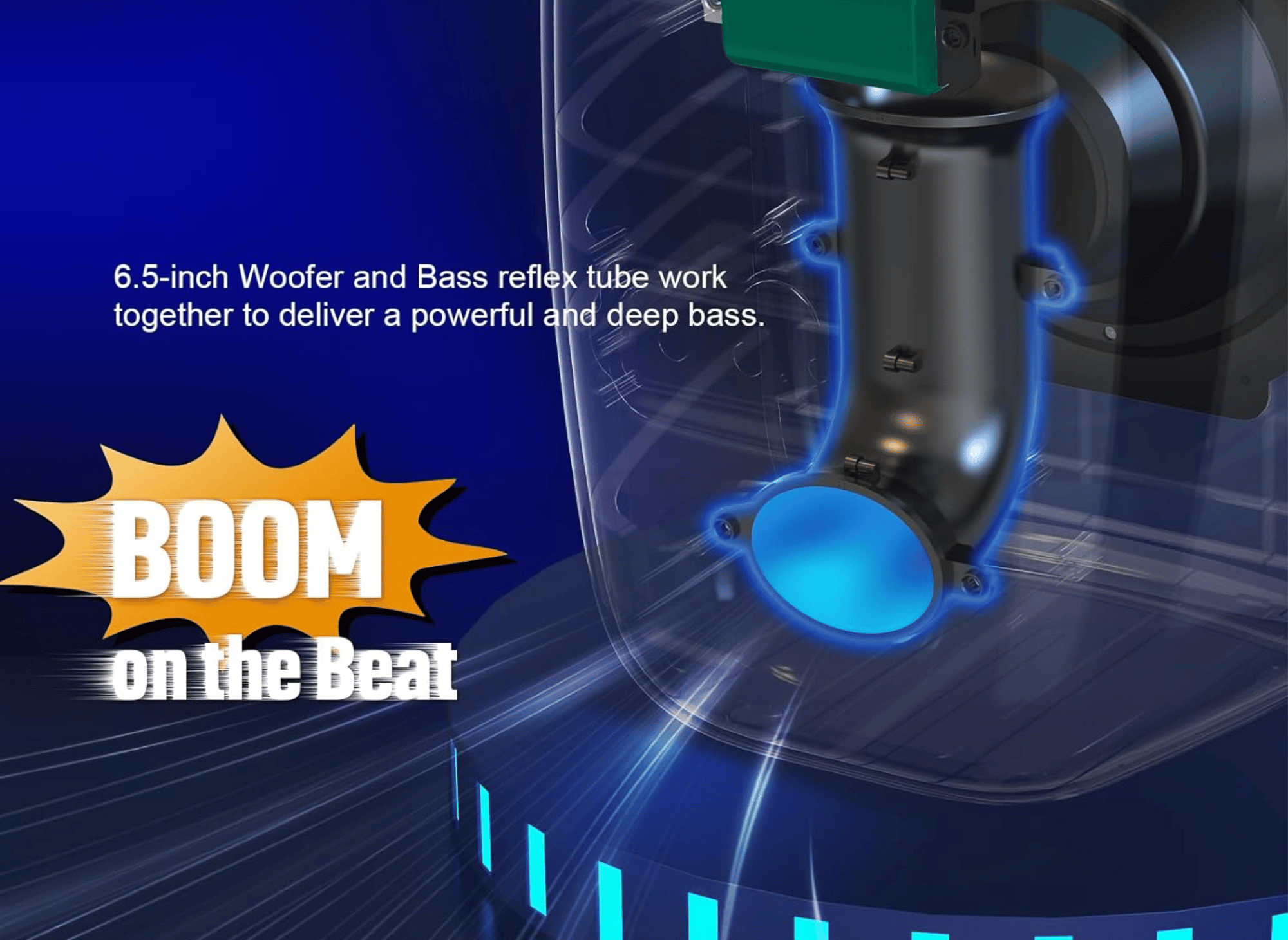 At the heart of PartyBoom’s audio performance is its impressive 2.1-channel system. This setup features a substantial 6.5-inch woofer dedicated to producing deep, resonant bass, as well as dual 2-inch tweeters that handle the mid and high frequencies with precision. The 2.1 channel system and woofer deliver active extra bass, providing a dynamic listening experience with powerful, enhanced bass.