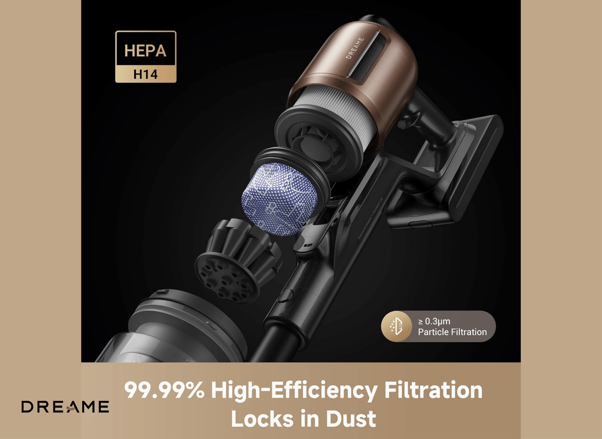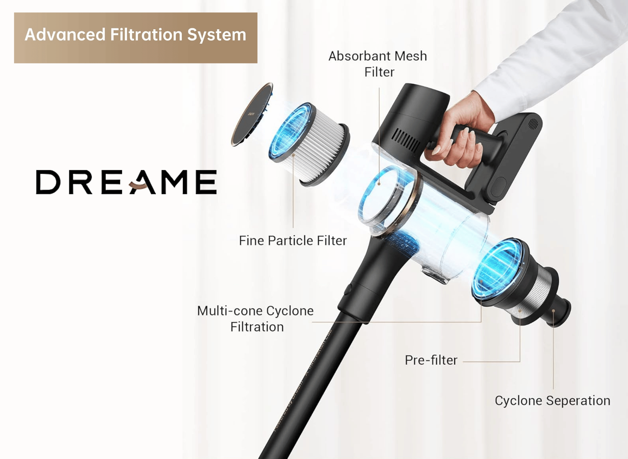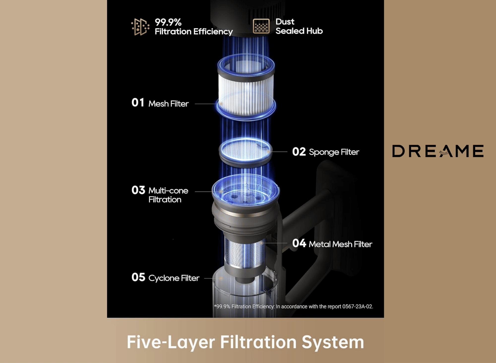 Clean floors matter, but clean air issues just as much. The DREAME Z20 five-layer filtration system captures microscopic particles and allergens that other vacuums might miss. This multi-stage filtration process includes: