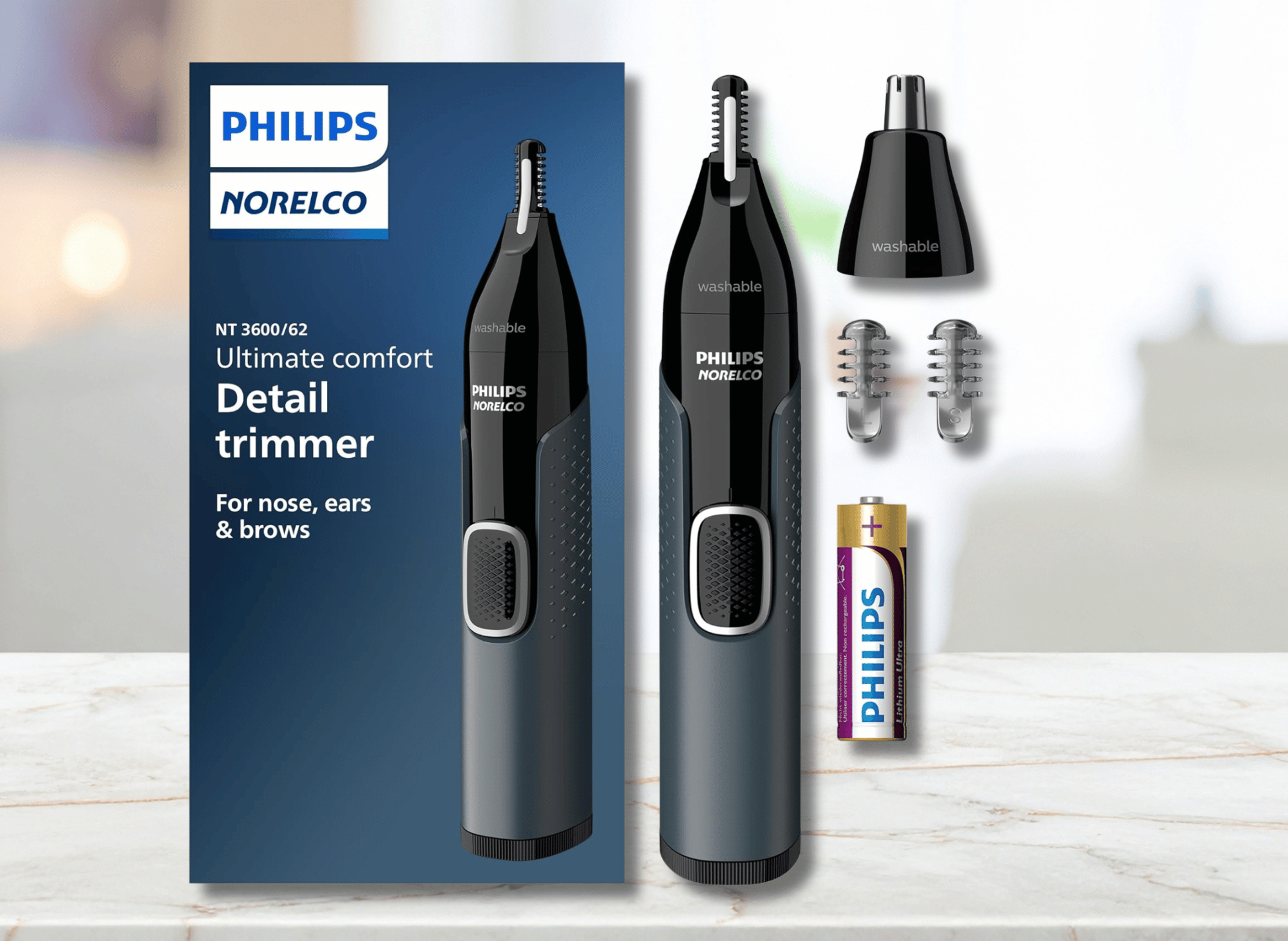- Includes: Ear & nose trimmer, 2 head attachments, cleaning brush, protective cap, storage bag