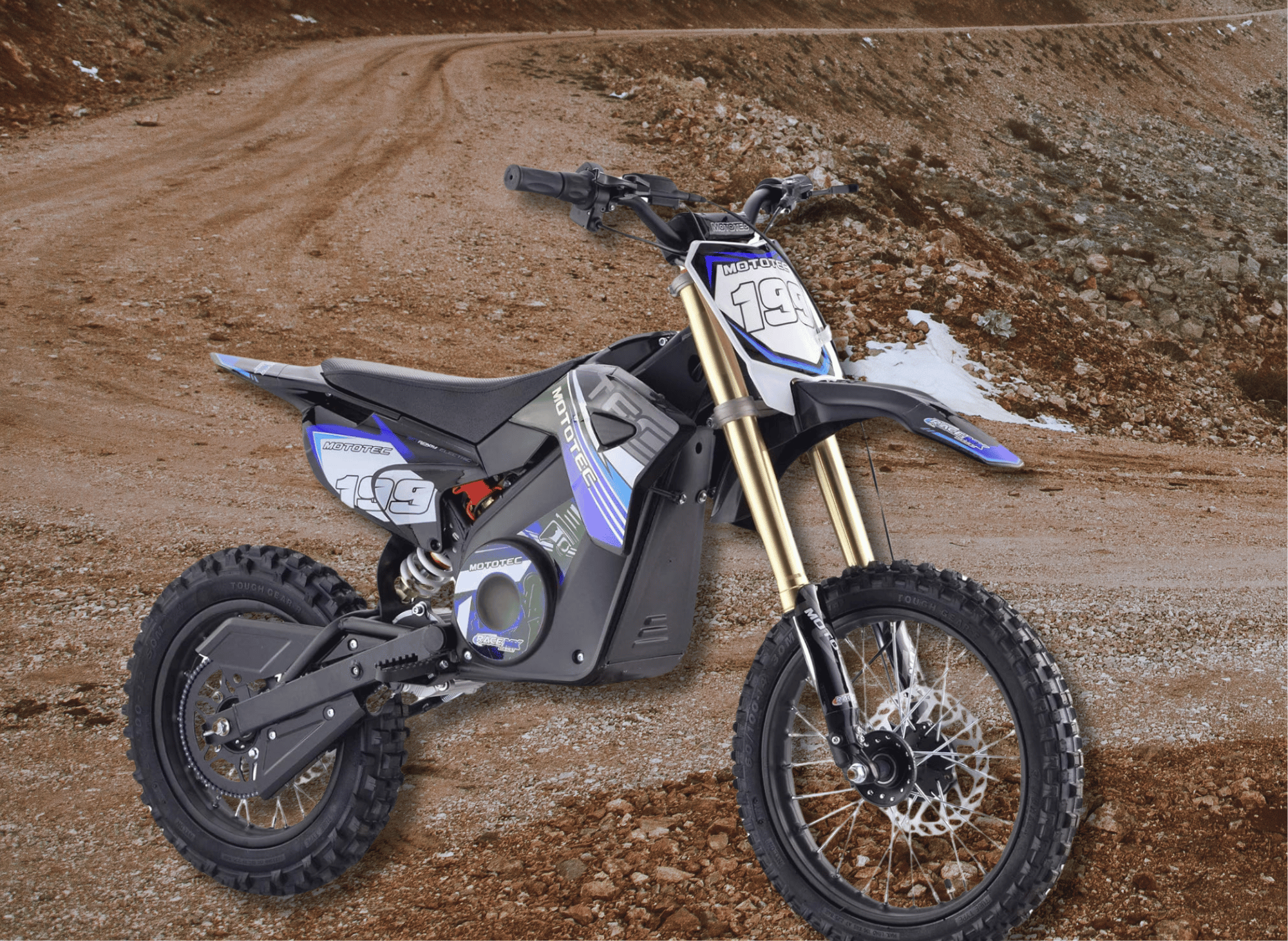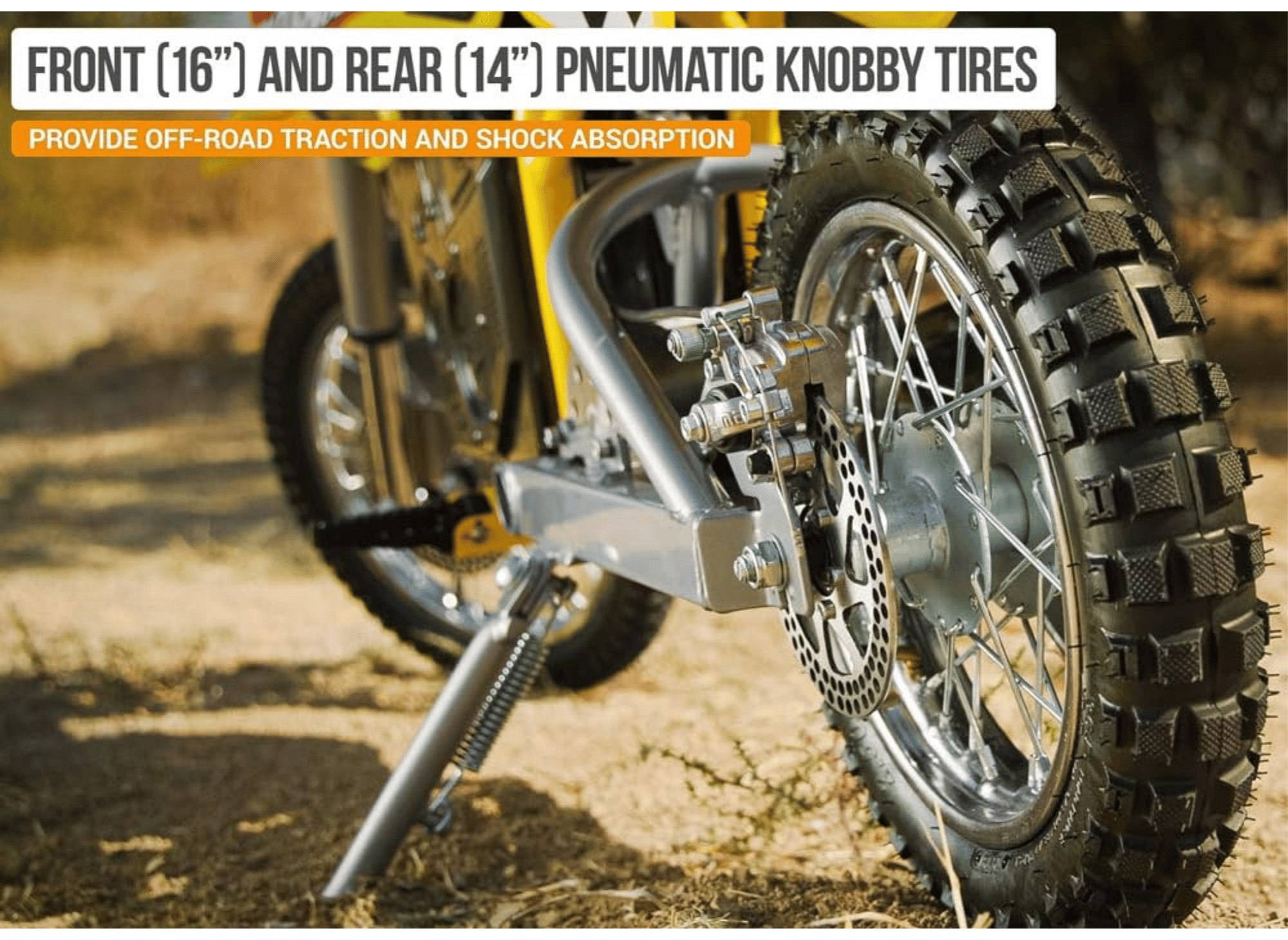 Constructed with a sturdy steel frame and featuring knobby pneumatic tires (2.75x14 front, 3.00x12 rear), the MotoTec Pro Electric Dirt Bike offers superior durability and performance. The aluminum rims, front and rear disc brakes, two hydraulic front shocks, and one rear shock provide a smooth and controlled ride.