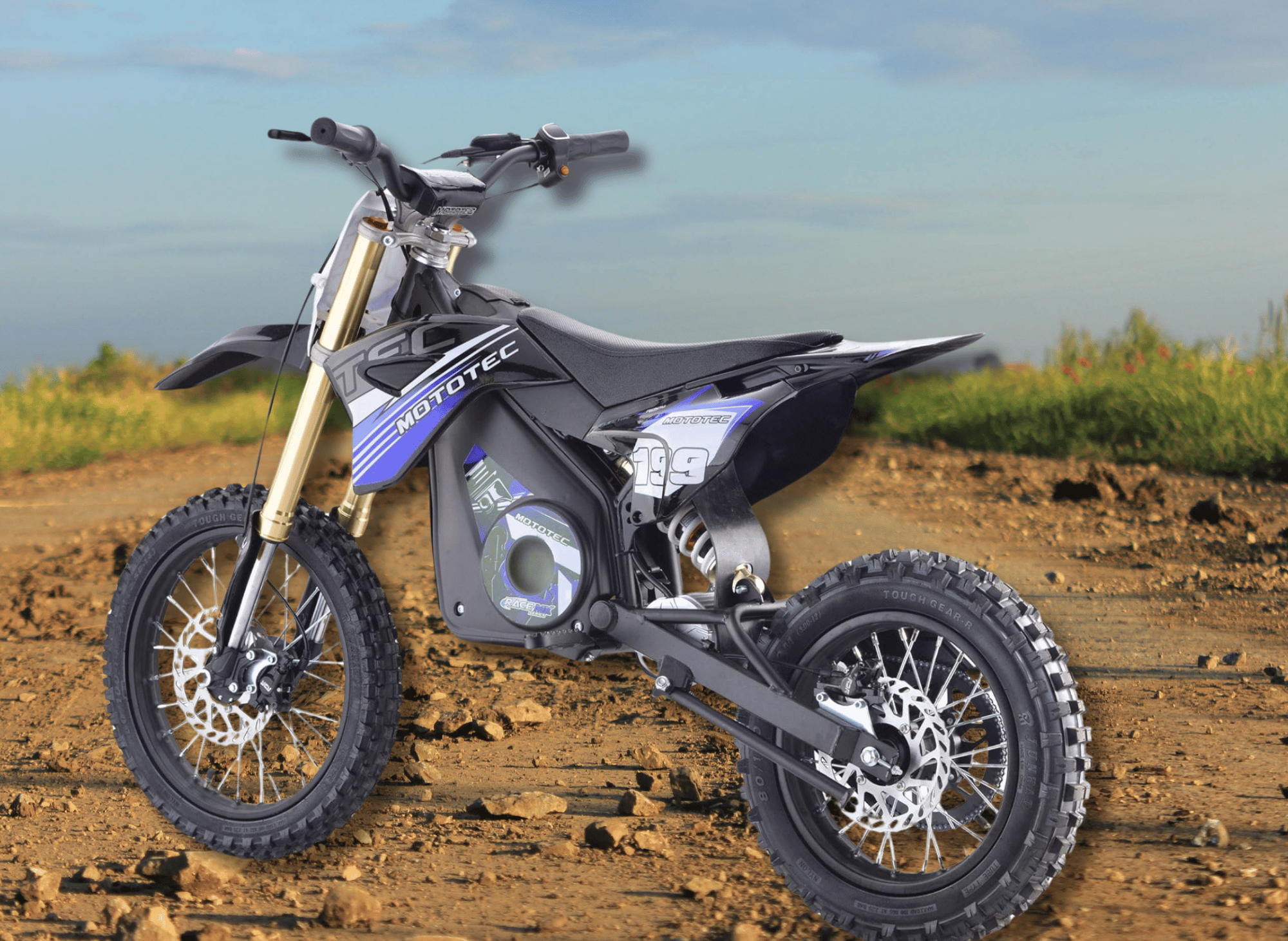 Constructed with a sturdy steel frame and featuring knobby pneumatic tires (2.75x14 front, 3.00x12 rear), the MotoTec Pro Electric Dirt Bike offers superior durability and performance. The aluminum rims, front and rear disc brakes, two hydraulic front shocks, and one rear shock provide a smooth and controlled ride.
