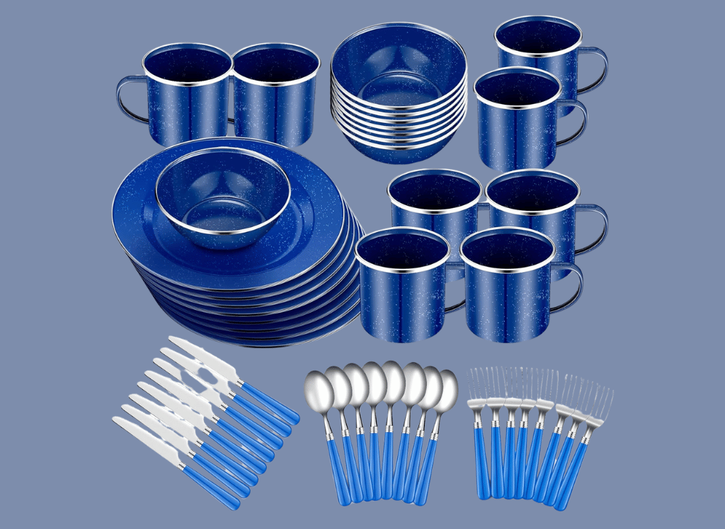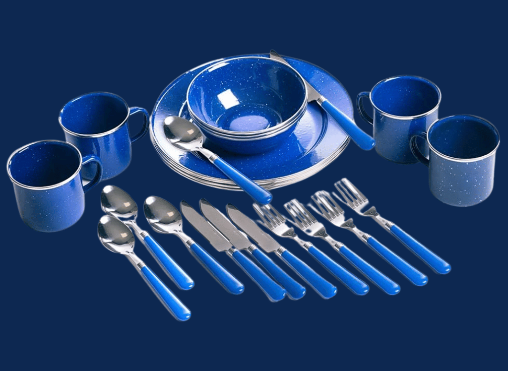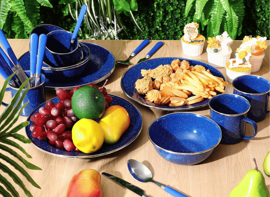 - Durability: Made from steel and coated with blue-speckled enamel, this dishware set is built to last and withstand the rigors of outdoor use.