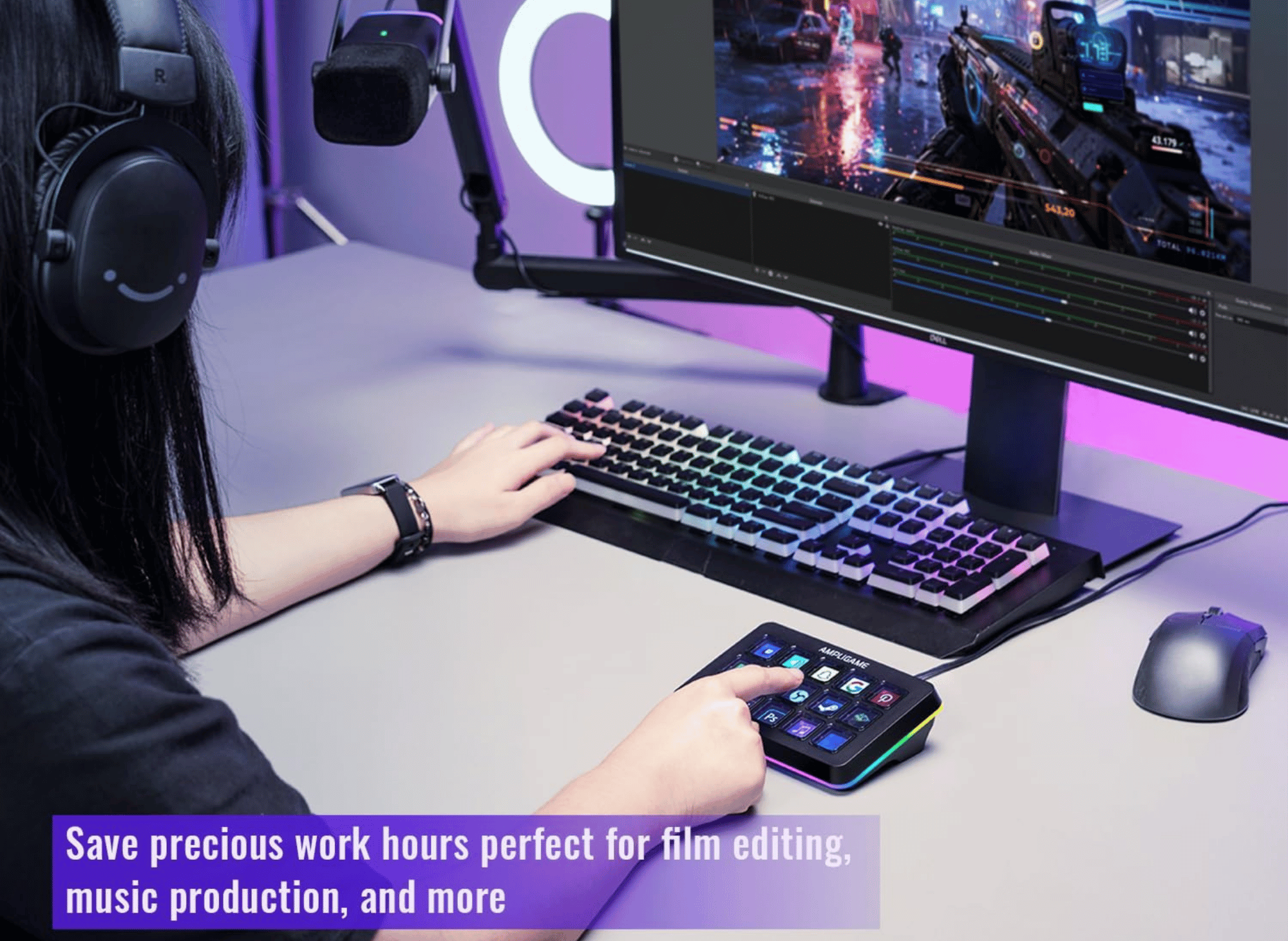 Its versatility shines in streaming and other areas like video editing, music production, photo editing, and even office work, allowing you to execute complex shortcuts with one press.