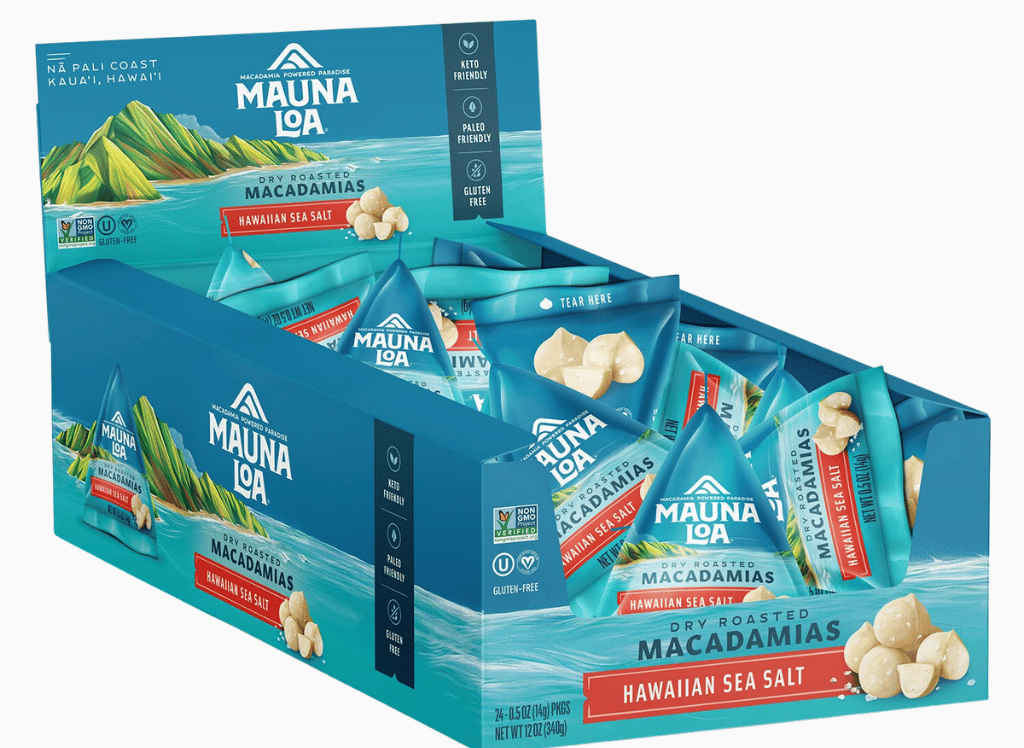 These salty-sweet delights are perfect for snacking on their own or adding to your favorite cocktail for an extra kick. Next up, Mauna Loa premium macadamia nuts are a luxurious snack that is great for sharing or enjoying alone.