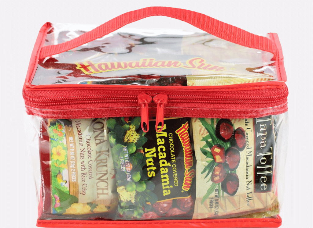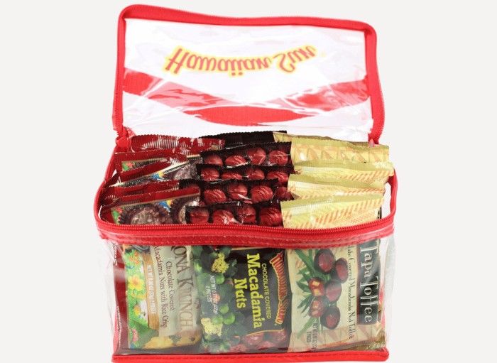 Unleash your inner foodie and indulge in the ultimate Hawaiian treat with our deluxe plastic zipper bag. This bag is every snacker's dream come true with 15 individual pouches inside, each containing a different irresistible delight. Our recommended picks are the Regular Chocolate Covered Macadamia Nuts, Tapa Toffee, and Kona Krunch.