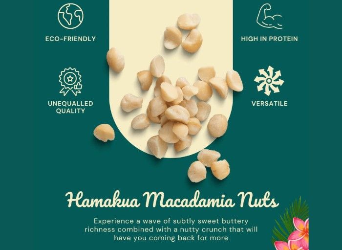 Experience the delicious nutty flavor of Hamakua Macadamia Nuts! Their large half and whole macadamias are packed with protein, fiber, and antioxidants to give you a delightful crunch throughout your day.