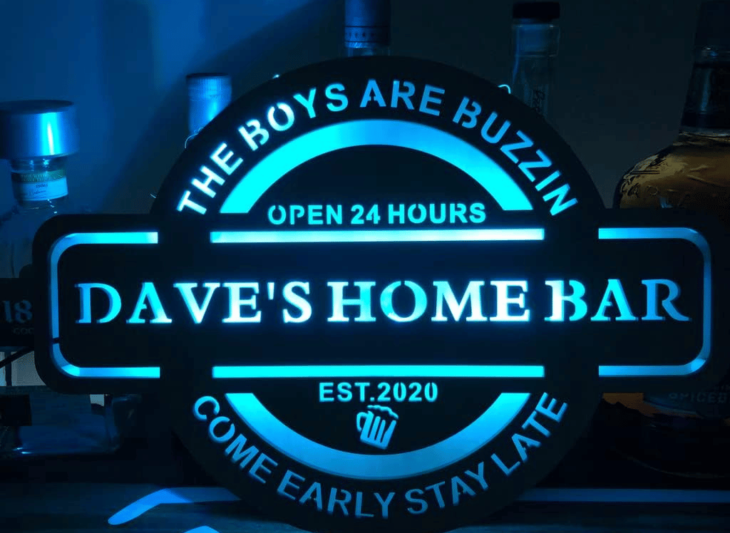 Home bar signs can be made of various materials, such as wood, metal, glass, and plastic. Wooden signs are typically handcrafted and have a rustic charm. In contrast, metal signs offer a more industrial look. Glass signs add a touch of elegance, and plastic signs are lightweight and often more affordable.