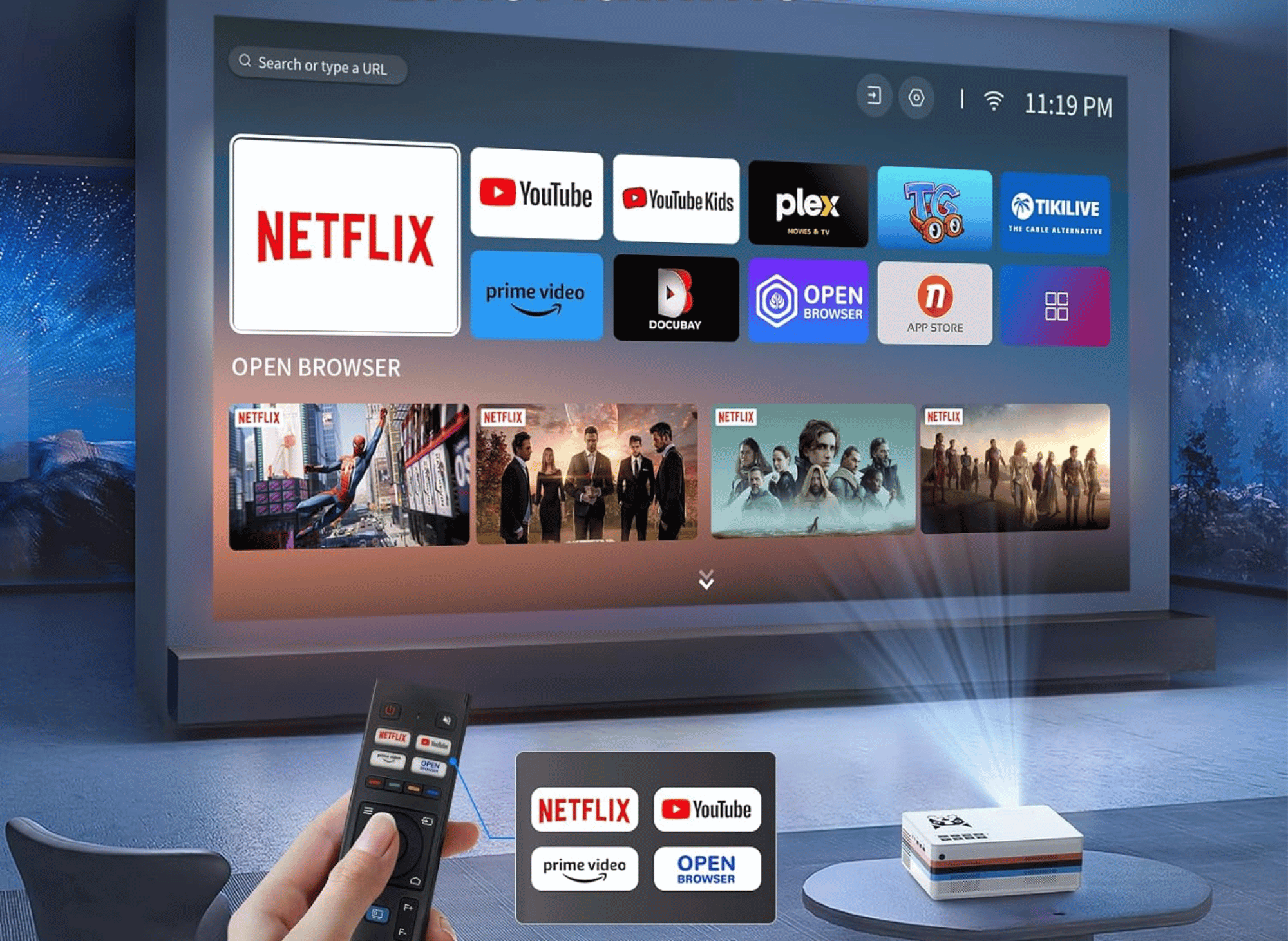 Equipped with Google TV and licensed Netflix, this projector seamlessly streams your favorite shows and movies. Access over 10,000 apps, including YouTube, Prime Video, Hulu, and Disney+, all in one convenient place.
