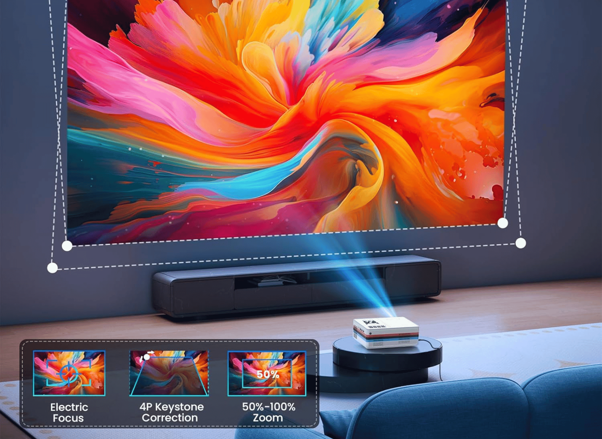 - Versatile Projection Options: With adjustable projection sizes from 40" to 200", the projector accommodates various room sizes and outdoor settings, ensuring an optimal viewing experience wherever you are.