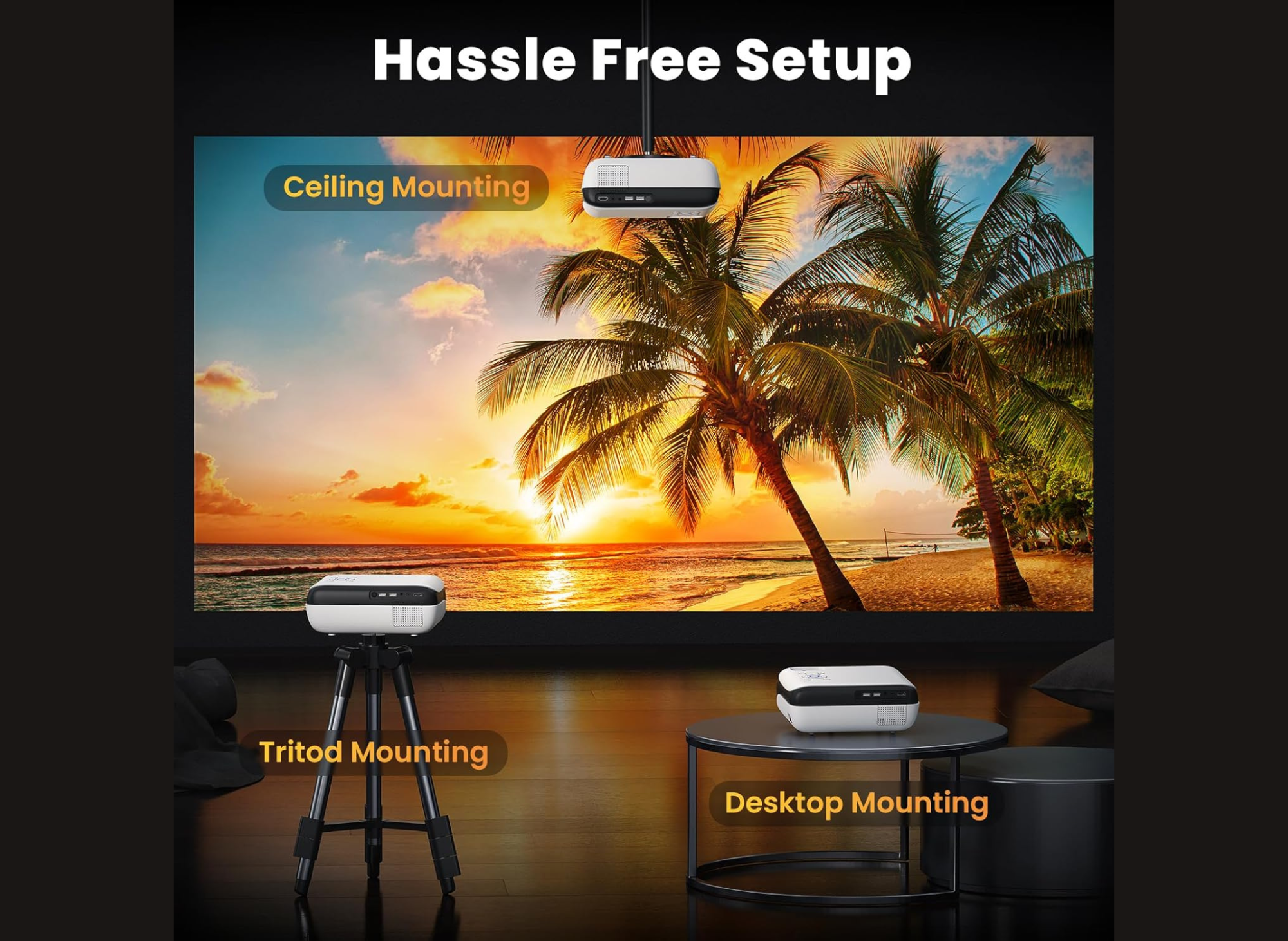 - Flexible Mounting Options: The projector’s portable and tabletop design allows you to set it up wherever you choose, while 60-100% zoom capabilities provide a large display of up to 300 inches.