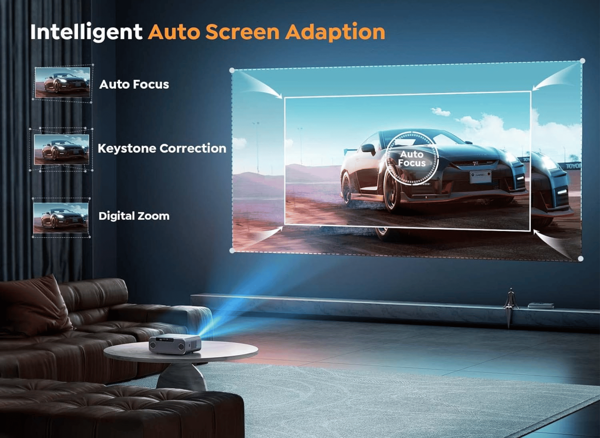 With just a touch of a button, the projector will automatically adjust to provide a clear and well-aligned image in just 5 seconds. Equipped with a displacement gyroscope and sensor, it can detect environmental changes and adapt accordingly for optimal clarity.