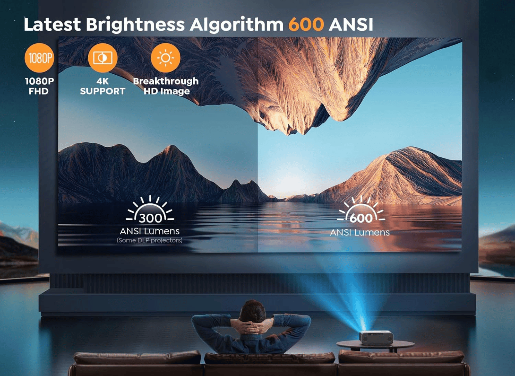 - High-Quality Visuals: Native 1080P resolution with 600 ANSI brightness ensures sharp, vibrant images, while 4K support enhances the viewing experience.