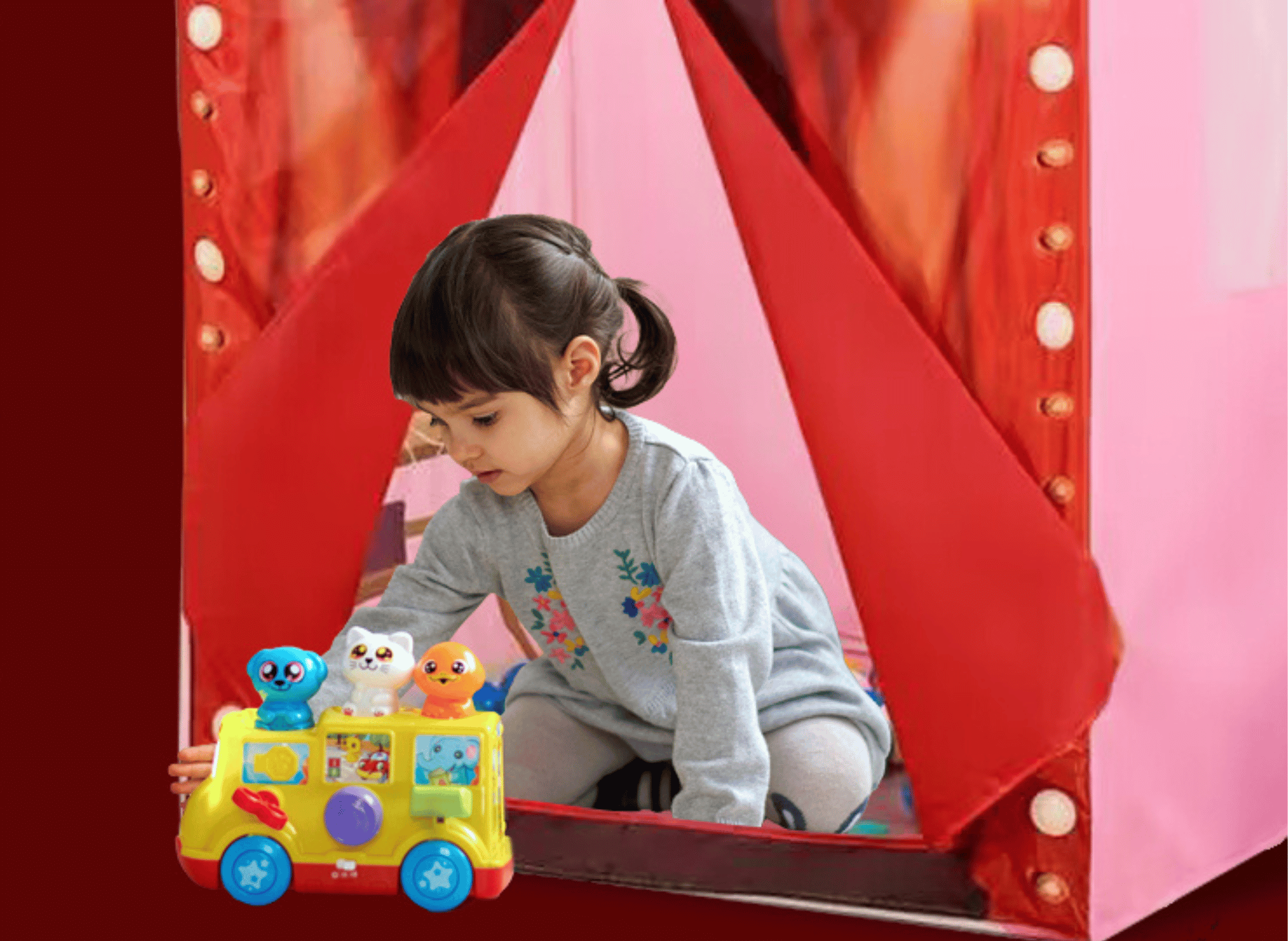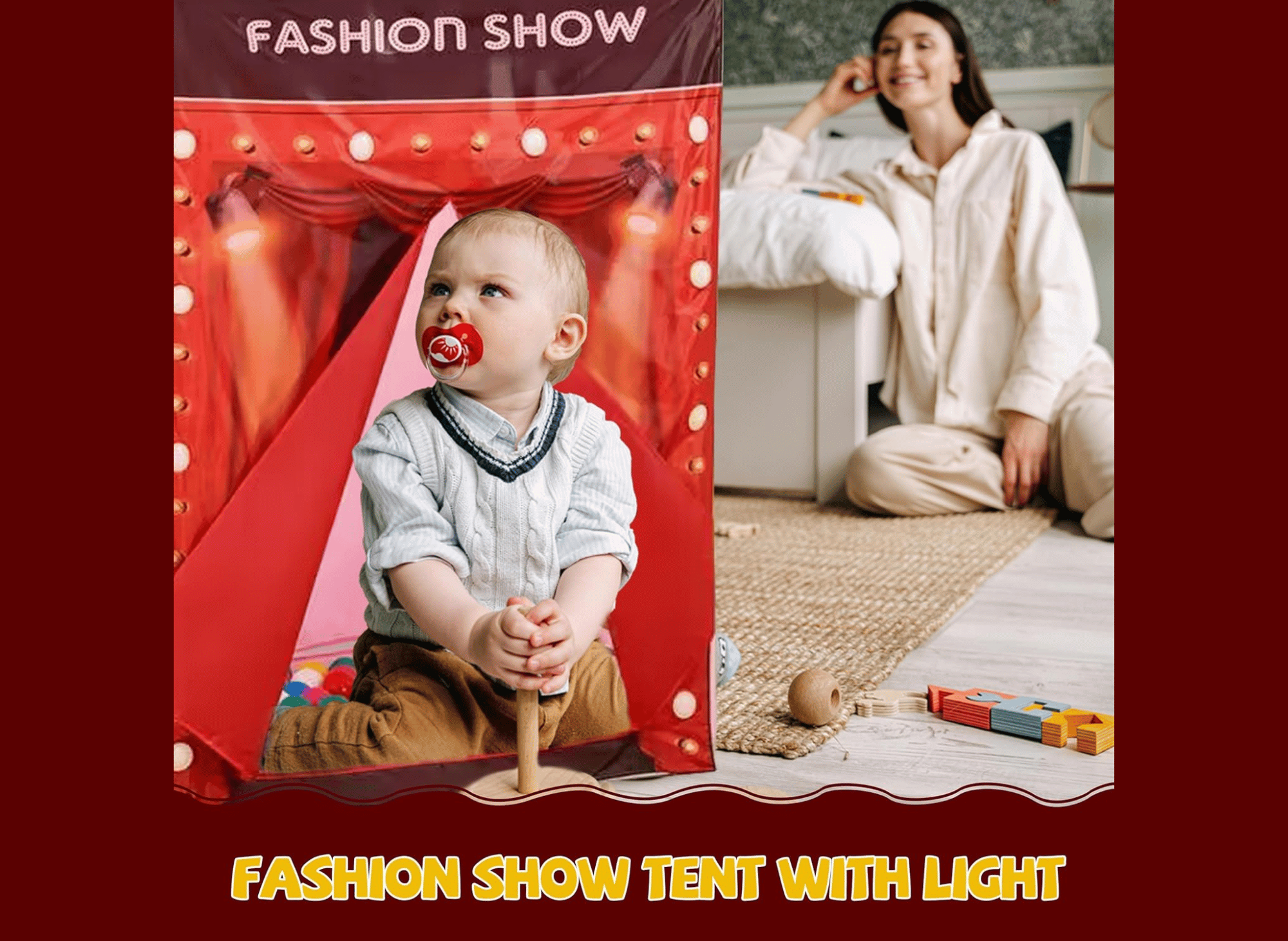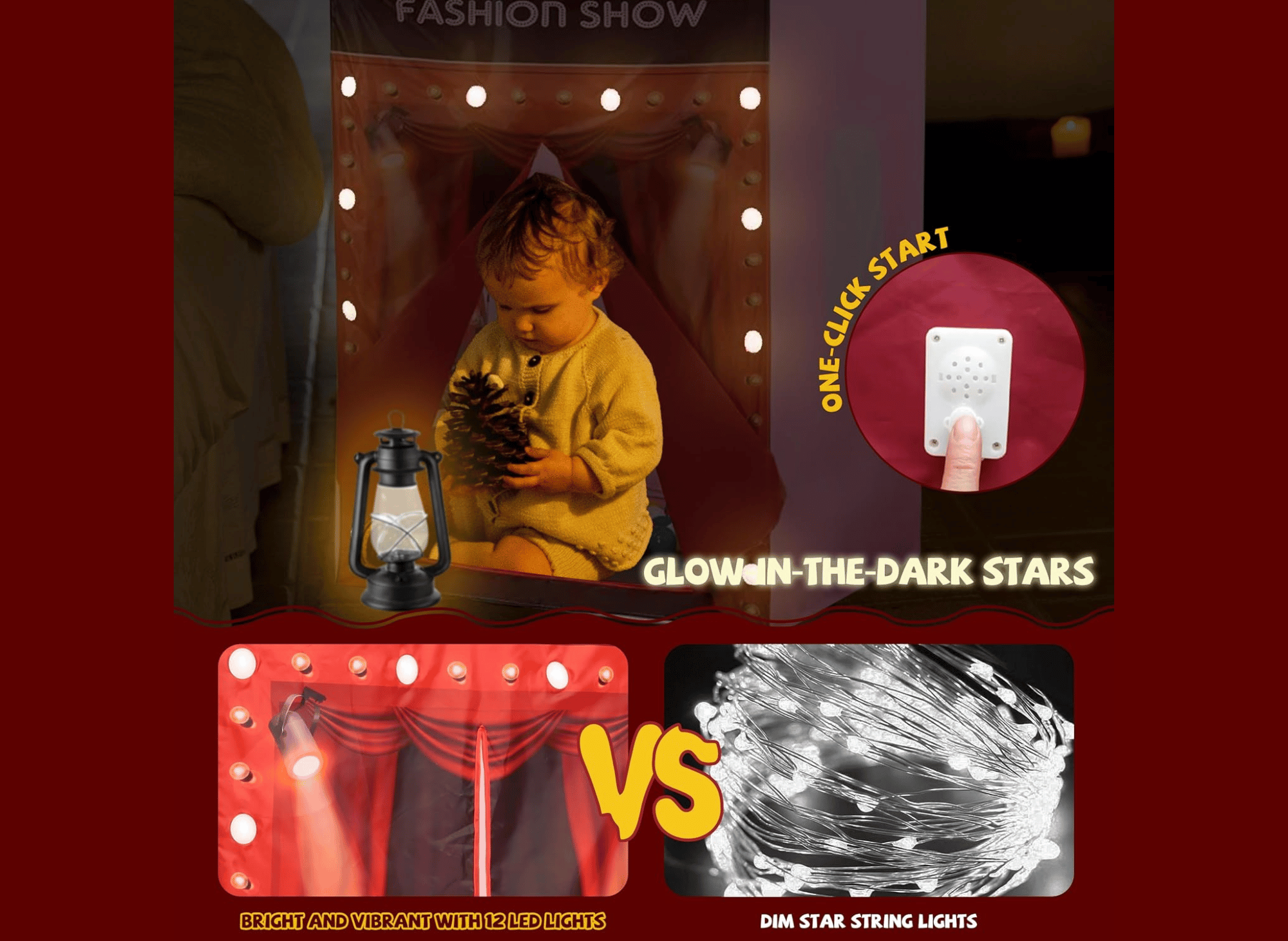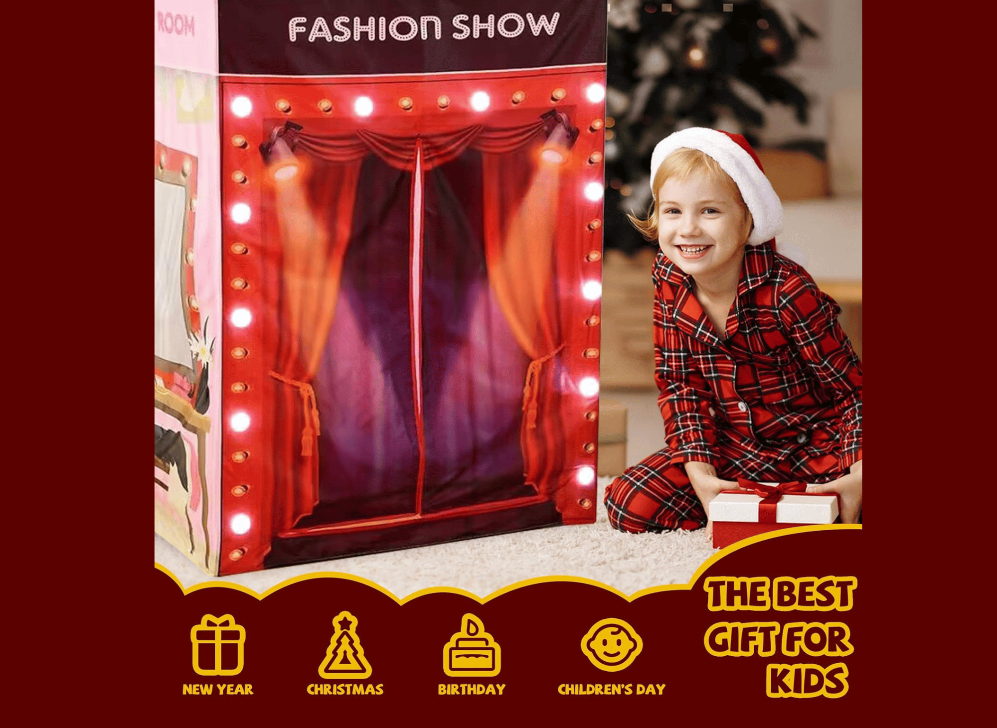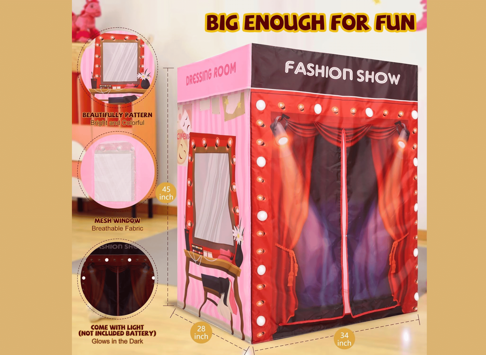 Equipped with multiple light holders on its façade (batteries not included), this play tent resembles a real fashion stage. The soft glow from the lights adds a magical ambiance that enhances imaginative play. Whether hosting pretend fashion shows, playing dress-up, or reading quietly under its glow, the tent transforms playtime into a grand event.